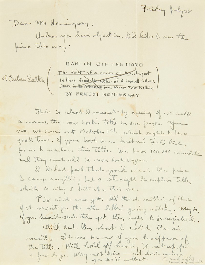 This lot includes a number of photographs, a six-page type-written manuscript, and a letter (pictured) concerning Hemingway’s piece, “Marlin Off the Morro: A Cuban Letter,” which published in the Autumn edition of Esquire in 1933. It followed the author on a marlin-fishing expedition off the coast of Cuba. The letter is from Hemingway’s editor, asking for him to approve the title and asking after the photos. Pre-auction estimate: $30,000–$50,000. For more on the lot, click here.