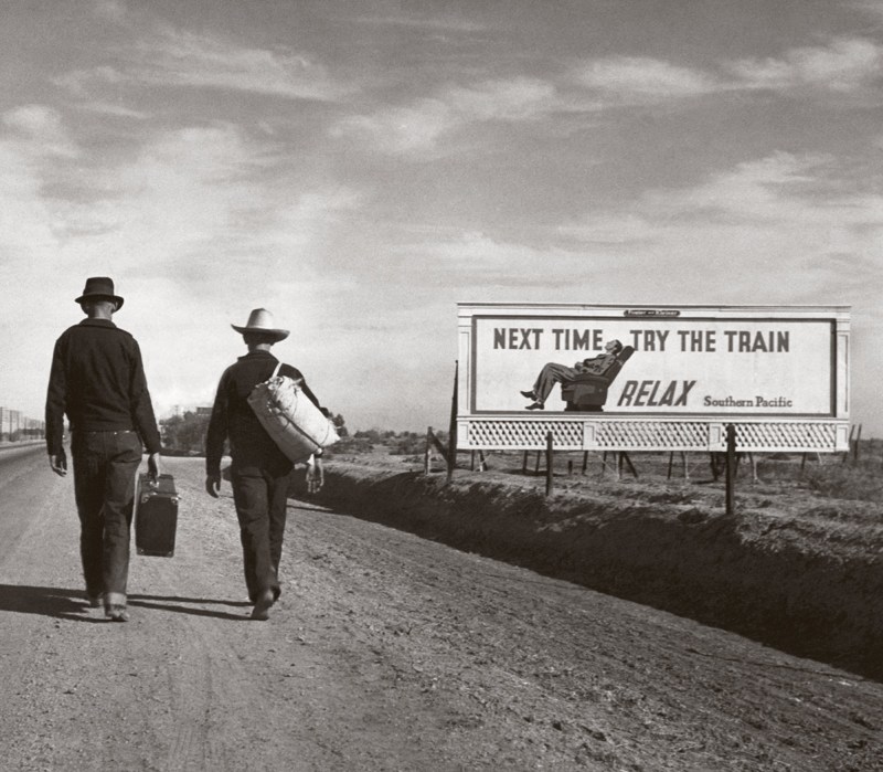 Farmers from the Dust Bowl regions laid waste by drought follow Route 66 on their way to California -photo titled Toward Los Angeles by Dorothea Lange, 1937 (Dorothea Lange/Bettmann Archive/Getty Images)
