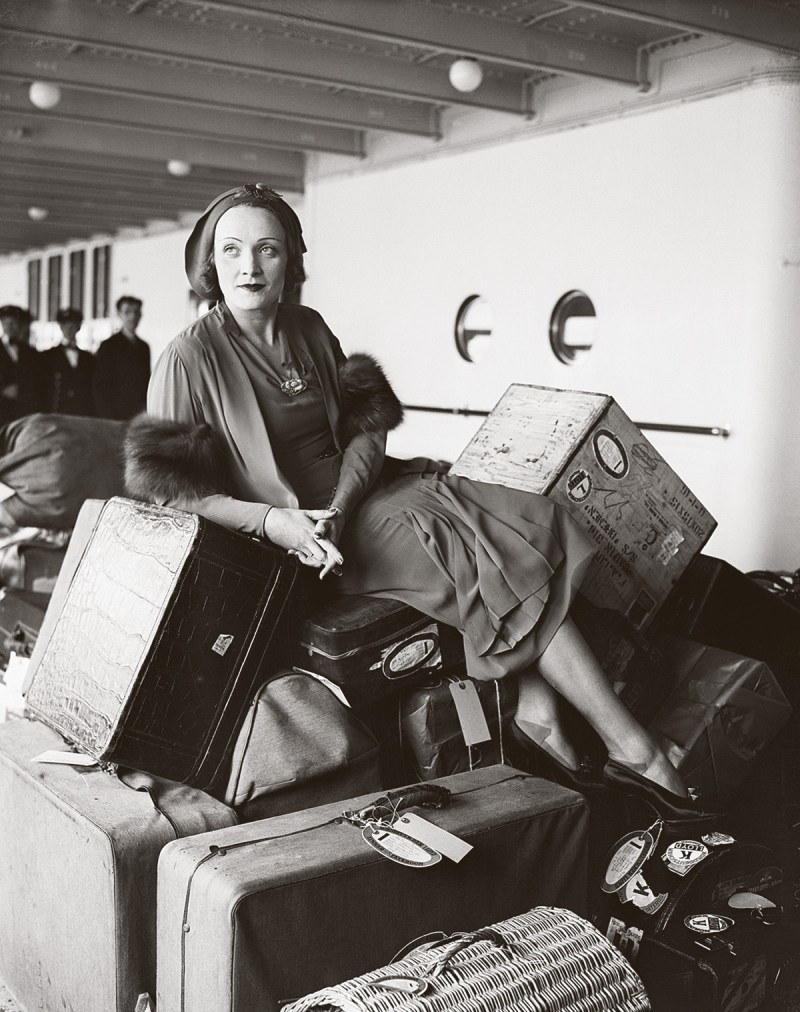 German movie star Marlene Dietrich with a pile of luggage en route to the USA on the ocean liner Bremen, 1931 (Bettmann Archive/Getty Images)