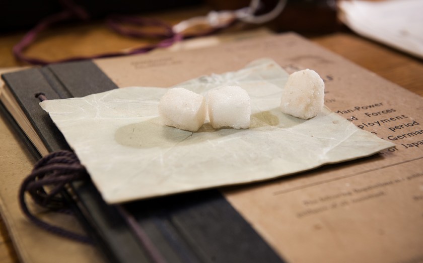 “These sugar cubes belonged to Wing Commander John Heagerty, one of the officers who manned the Map Room from 1939 through to 1945. Sugar was in short supply during the war, and Heagerty appears to have hidden his in an envelope at the back of one of his drawers, where it lay undisturbed until IWM conducted a thorough inventory of the war rooms in the early 1980s. From the shape of one of the cubes, it looks as if the officer may have conducted his own rationing system, shaving off small amounts of sugar as and when he needed it.”