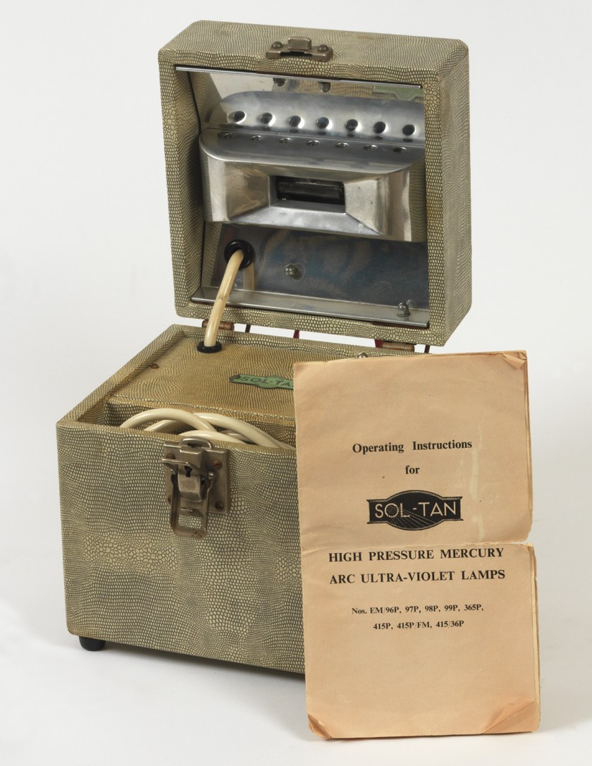 “To alleviate the health problems associated with working underground for prolonged periods of time, staff were made to strip to their underwear, put on a pair of protective goggles and stand in front of portable sun lamps like this one. Incidences of ‘sunburn’ were common, and one veteran recalls a ‘silly girl’ who forgot to put on the goggles and nearly went blind.”
