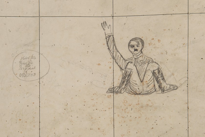 “The large map on the lefthand wall of the chiefs of staff conference room sports a curious addition. If you trace a line due west from the far north-west tip of Scotland, you will come across this hand-drawn caricature of German leader Adolf Hitler. It is not known when this mocking piece of graffiti was added.”