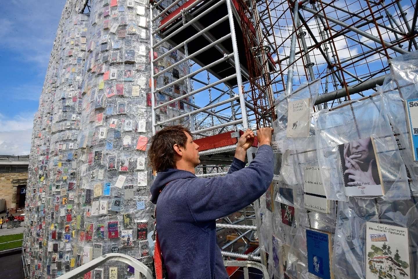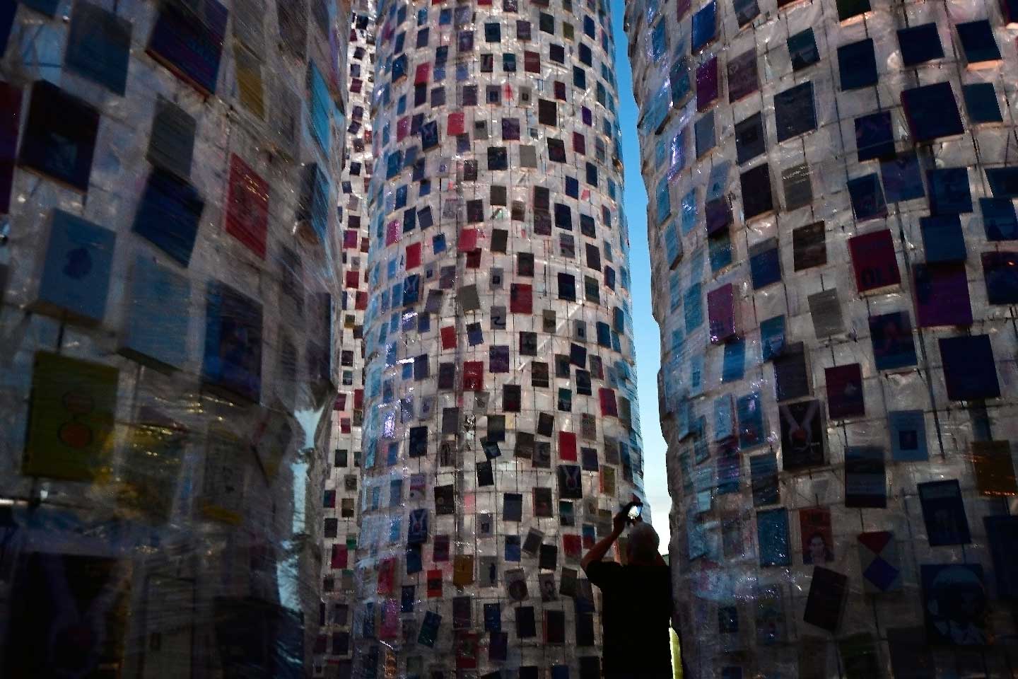 According to Architectural Digest, Minujín is creating the structure using 100,000 copies of modern-day banned books, protected in plastic covering, that were secured to scaffolding mimicking the form of the temple.