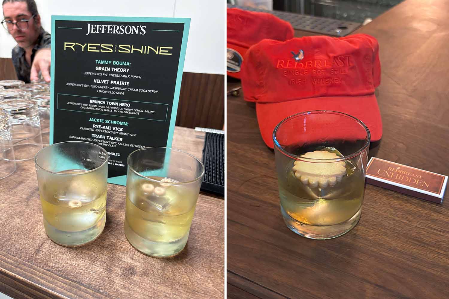 The gummy hot dog garnish used by Denver’s Yacht Club at the Suntory Global Spirits shindig on Thursday afternoon was fun, the Bazooka gum supporting the Bazooka-infused Sally on the Moon #2 at Fords Gin was cute and I loved the actual Cheerios in my Grain Theory cocktail at the first of many Jefferson’s whiskey events, but earlier in the week I experienced two instances of miniature cookies being used as a topper for cocktails. I don’t believe the baked goods were anything special — I’m guessing store-bought, although high-end — but I had an Old Fashioned made with Redbreast that had a small, round shortbread cookie on top that added a lovely biscuit note on the nose and gave me a little snack during my drink. More cookie garnishes! — KM
