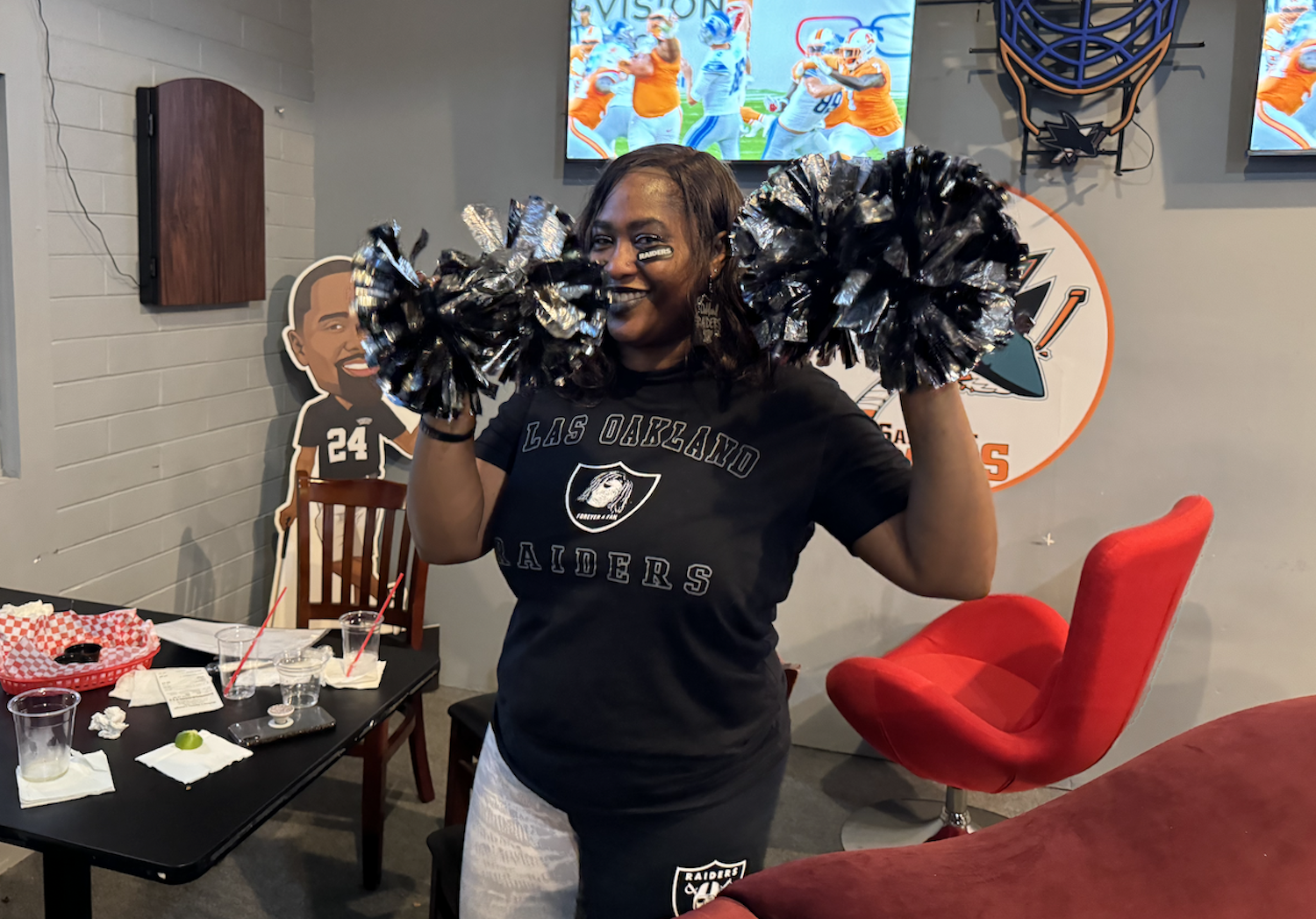 One fan, who introduces herself as “Raider Nae,” rocks custom Air Force Ones with her nickname embroidered on them. She has season tickets in Vegas, but decided to keep it local for this one. As one of her friends waves silver and black pom-poms at the screen on tight plays, I discover that another couple sitting nearby are headed to Chicago next weekend for the Raiders/Bears game. I am, too — so we swap numbers and hope to meet up for a tailgate at Soldier Field. You won’t find the unparalleled, unabashed chaos of the Coliseum at Rickey’s, but the distinct #Raidernation community ethos of parking lot tailgates feels very much alive here.