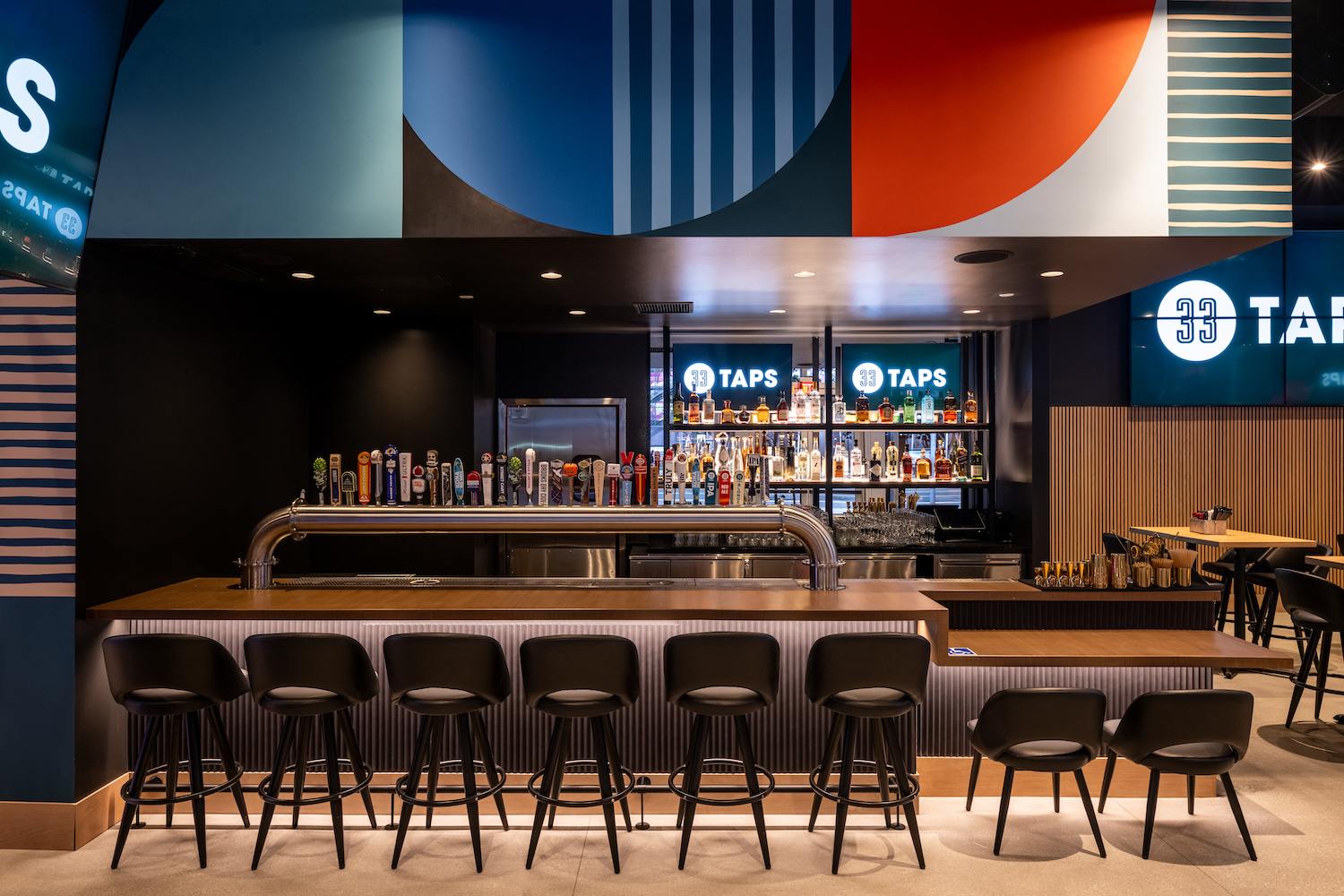 Bar area with a focus on the large row of beer taps in the center of the bar