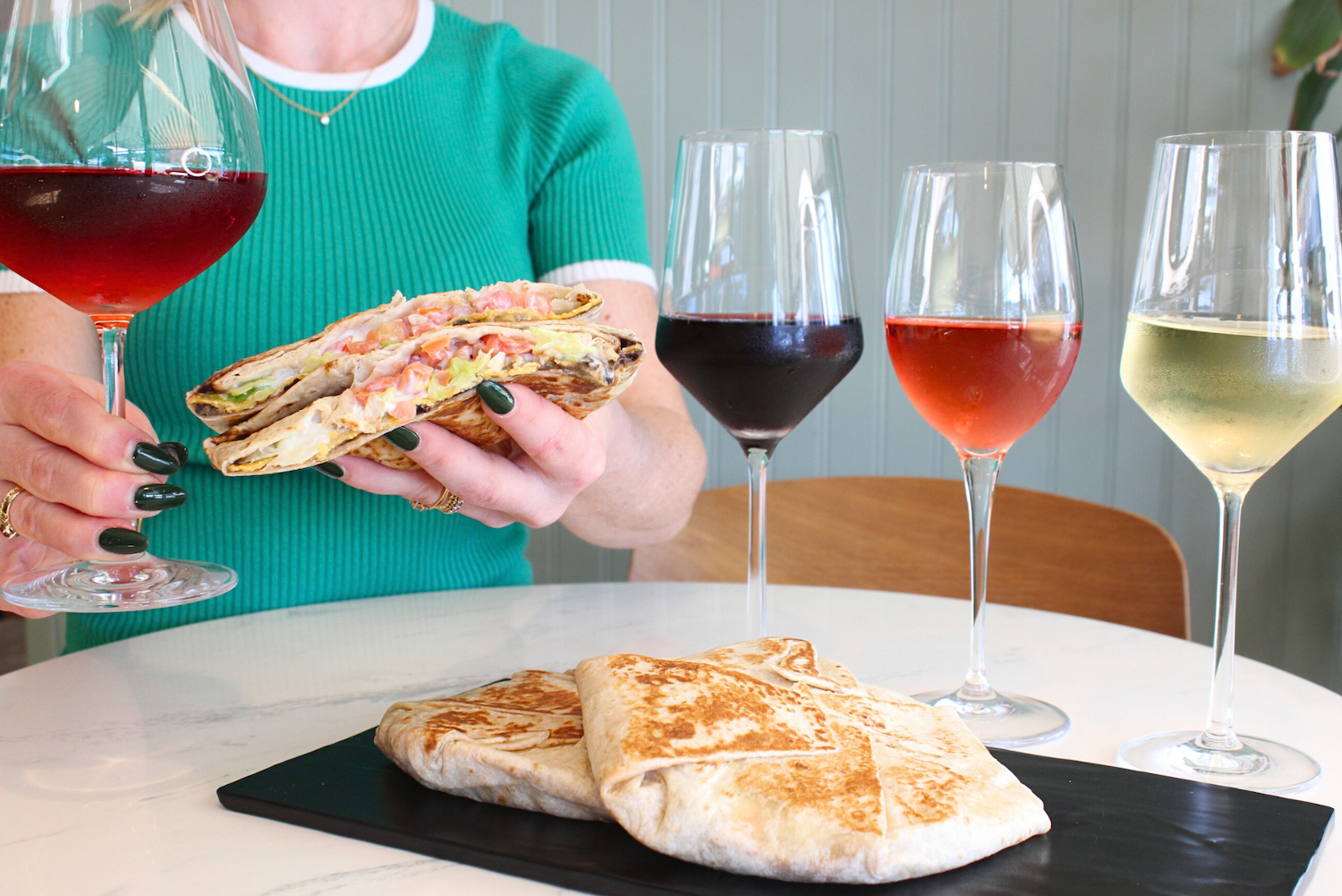 Crunchwrap Supremes on a plate with wine glasses filled with wine