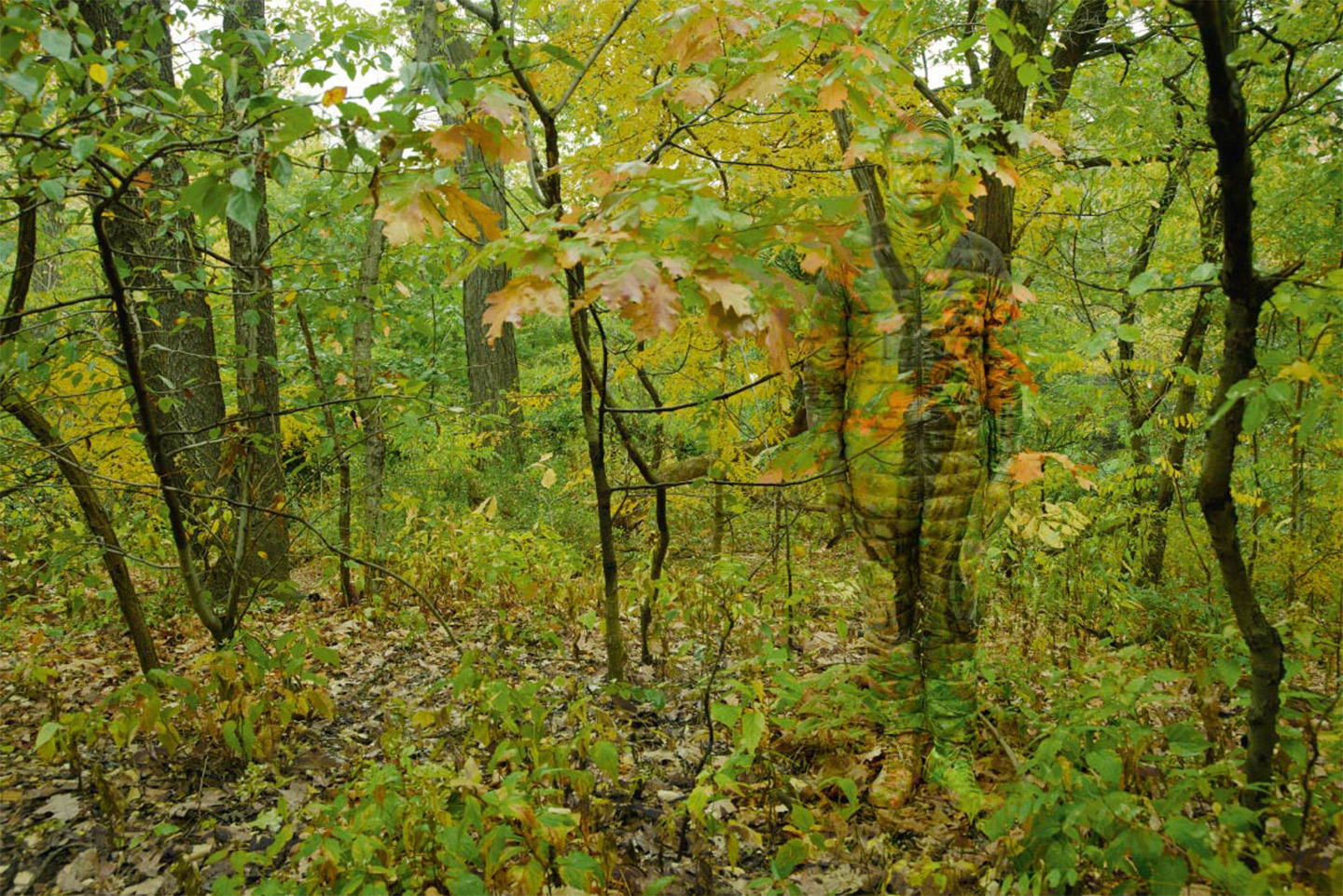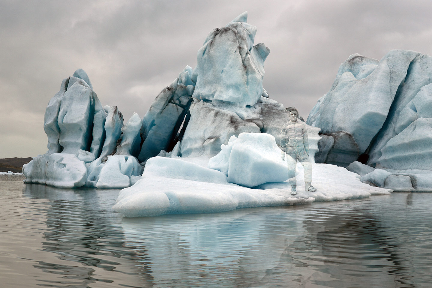 The outline of Bolin’s body can be seen blending into the different environments of each shot, such as the icy glaciers, the library stacked with books, or a leafy forest.