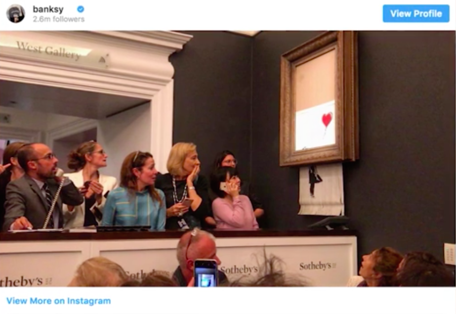 Immediately after his iconic work “Girl with Balloon” sold for £1 million ($1.4 million) at a Sotheby’s auction on Friday, the painting started to automatically slide out the bottom of its frame, getting shredded along the way. Stunned onlookers watched as the painting was neatly rendered into ribbons and auction security guards quickly tried to hustle it out of sight.
