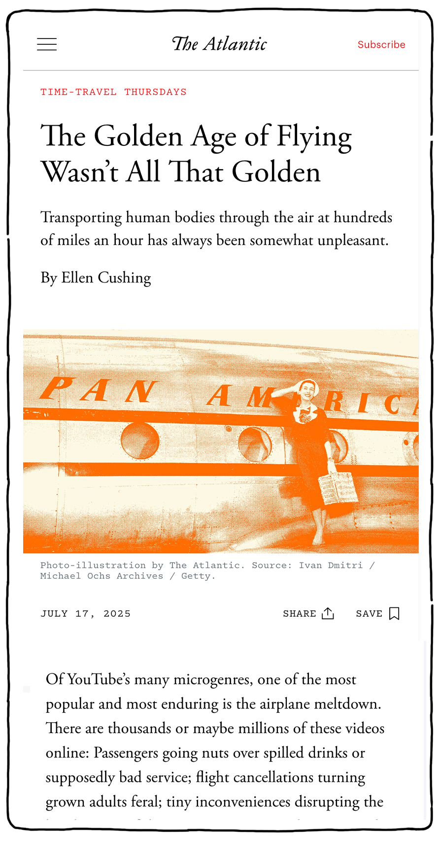 “Much like the journalism we publish today, our archives span a range of interests, wonders, fears and curiosities: They’re a time capsule revealing how smart minds have contemplated, analyzed and shaped our world for almost two centuries. When choosing stories to highlight for the Time-Travel Thursdays newsletter, we identify pieces that contextualize the big story of the moment through the lens of our history. We’re looking for ways to help examine, and reexamine, the American idea through the perspectives of our writers so that the lessons of our past might help illuminate our future. And true to The Atlantic’s core, we also highlight work that’s witty, delightful and deeply human, including meditations on love, dogs, wellness and the life cycle of facial hair. By sifting through the full scope of Atlantic essays published since our founding, we’re able to guide our readers through not just American history but the history of humans trying to make sense of their lives.”