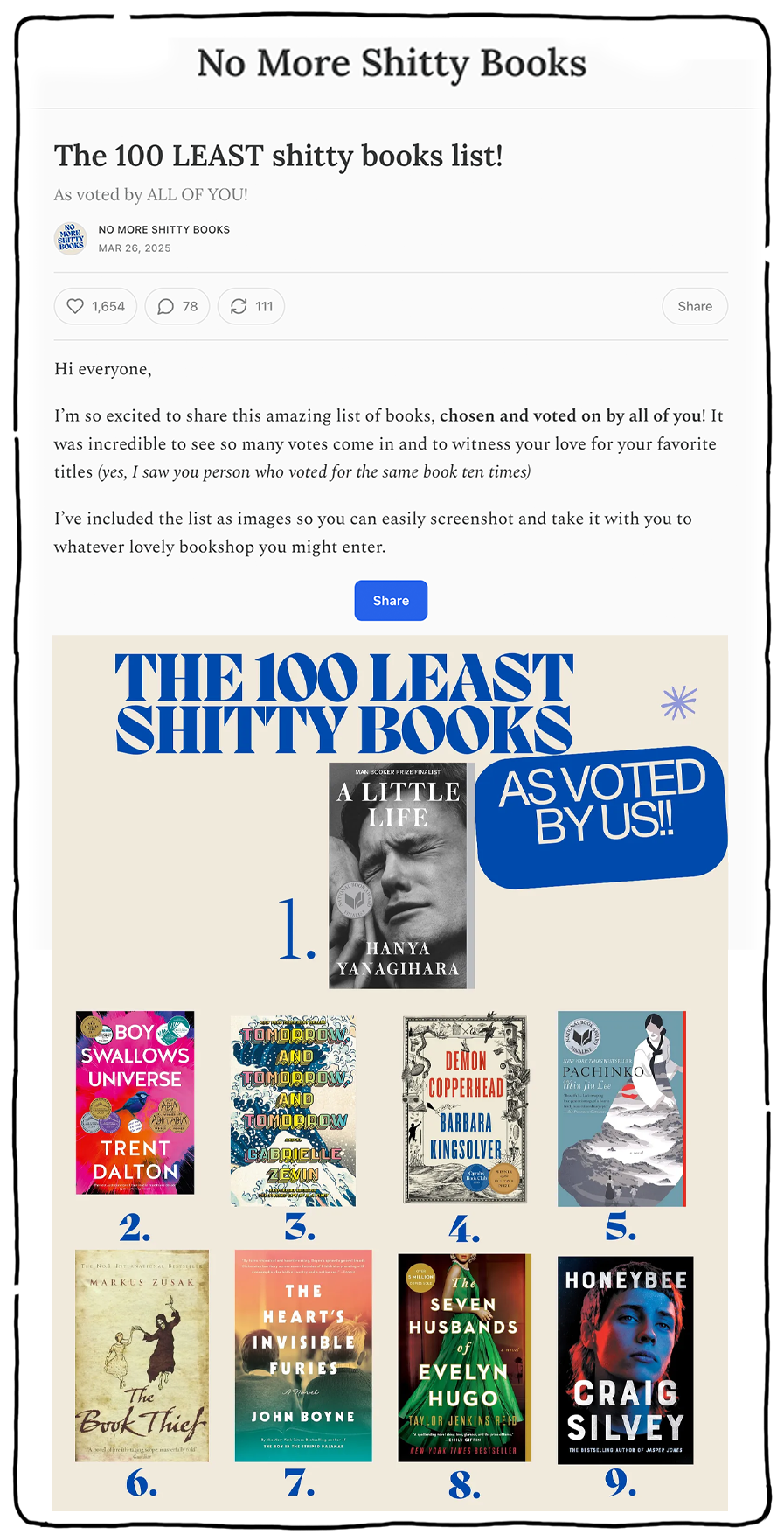 As if anyone needed a reminder that “influencing” isn’t as glamorous as it might look, Rachel Karten’s Link In Bio offers a clear-eyed peek behind the social media curtain and a genuine resource for anyone who is interested in making a career out of it. Featuring long-form interviews with industry players and frequent insights into what it takes to win on social in 2025, it’s a must-subscribe for the modern-day content creator. — PS