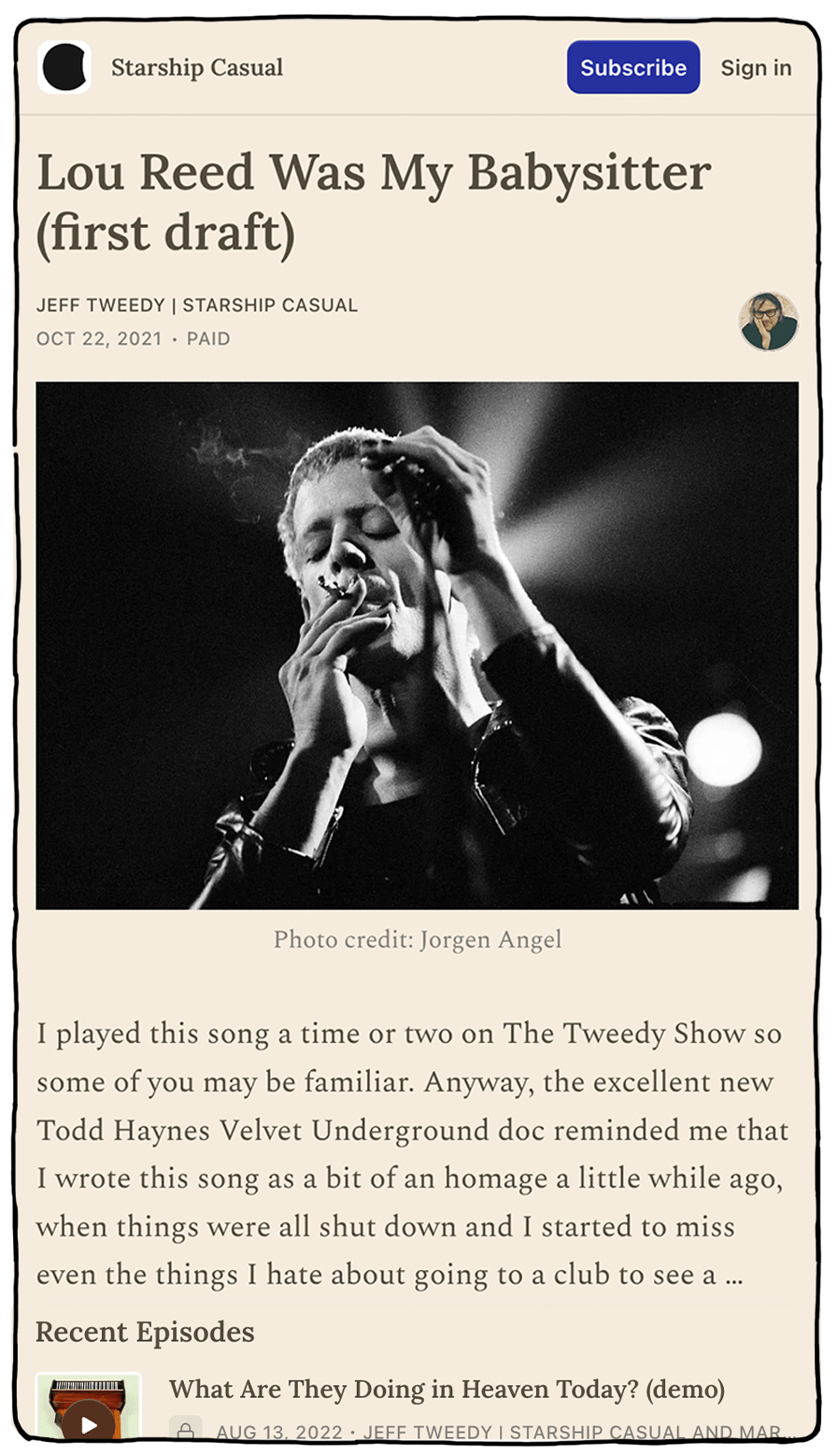 Jeff Tweedy’s newsletter is an absolute must for Wilco fans, or anyone with a passing interest in indie rock. He often shares unreleased songs or outtakes and old photos, has an advice column called “Dear Jeffy (Go Ask Susie),” has a section for the gearheads (called, fittingly, “GEAR TALKIN’”) and generally muses about life or offers updates from the road while on tour. — BS