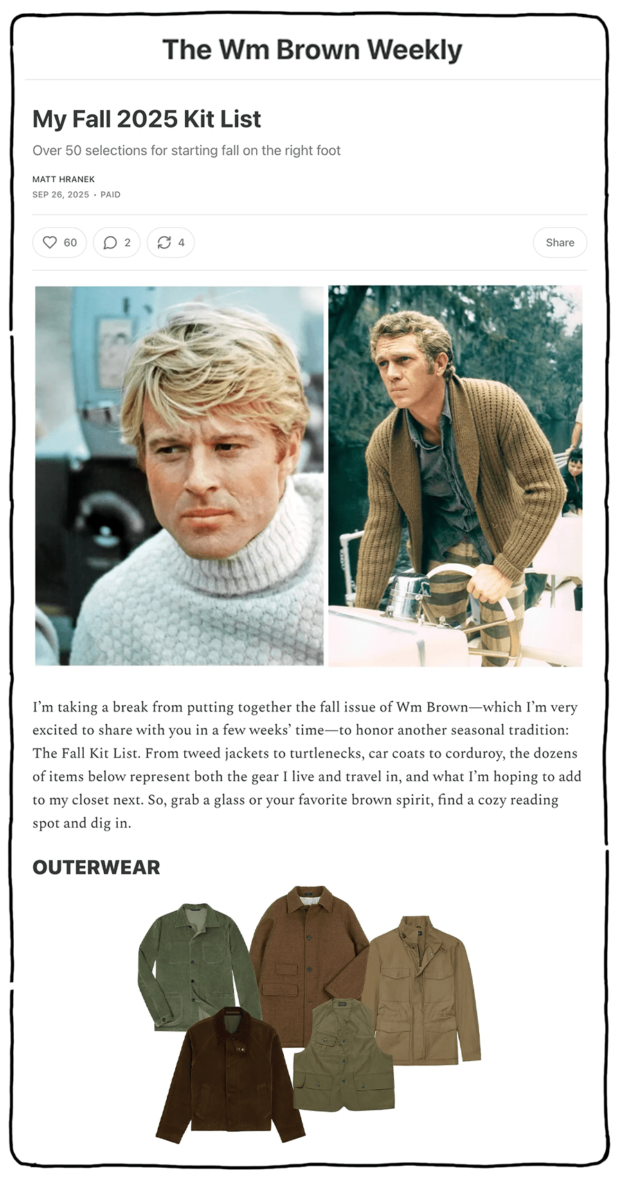 Matt Hranek’s weekly newsletter for his quarterly print magazine Wm Brown is one you don’t want to miss. He shares all kinds of fashionable, curated lifestyle snippets — style, drinks, food, watches, cars, you name is — creating a timeless, sophisticated profile of newsletters that any man would yearn to experience for themselves. — JS
