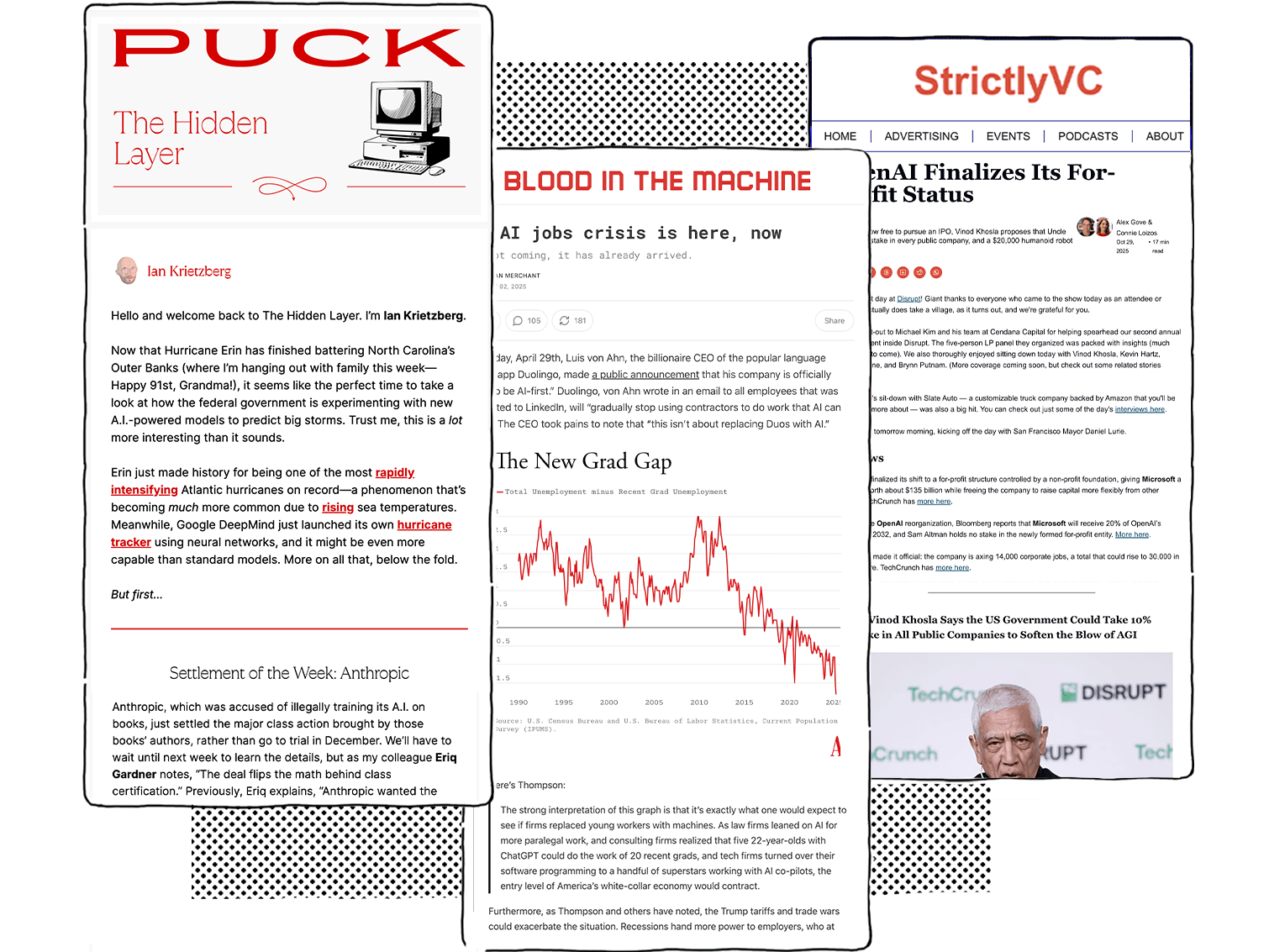 For an industry that’s projected to surpass $3 trillion within the next decades and is singlehandedly propping up the global economy, there are scant few voices covering AI with the clarity and favor it demands, and none as well as Puck’s Ian Krietzberg. The Hidden Layer parses into the confusing and often incestuous business of LLMS and GPUS, with all the hallmarks we’ve come to expect from Puck newsletters: expertly sourced and whip-sharp, with a tongue-in-cheek cattiness that keeps you coming back for more. — PS