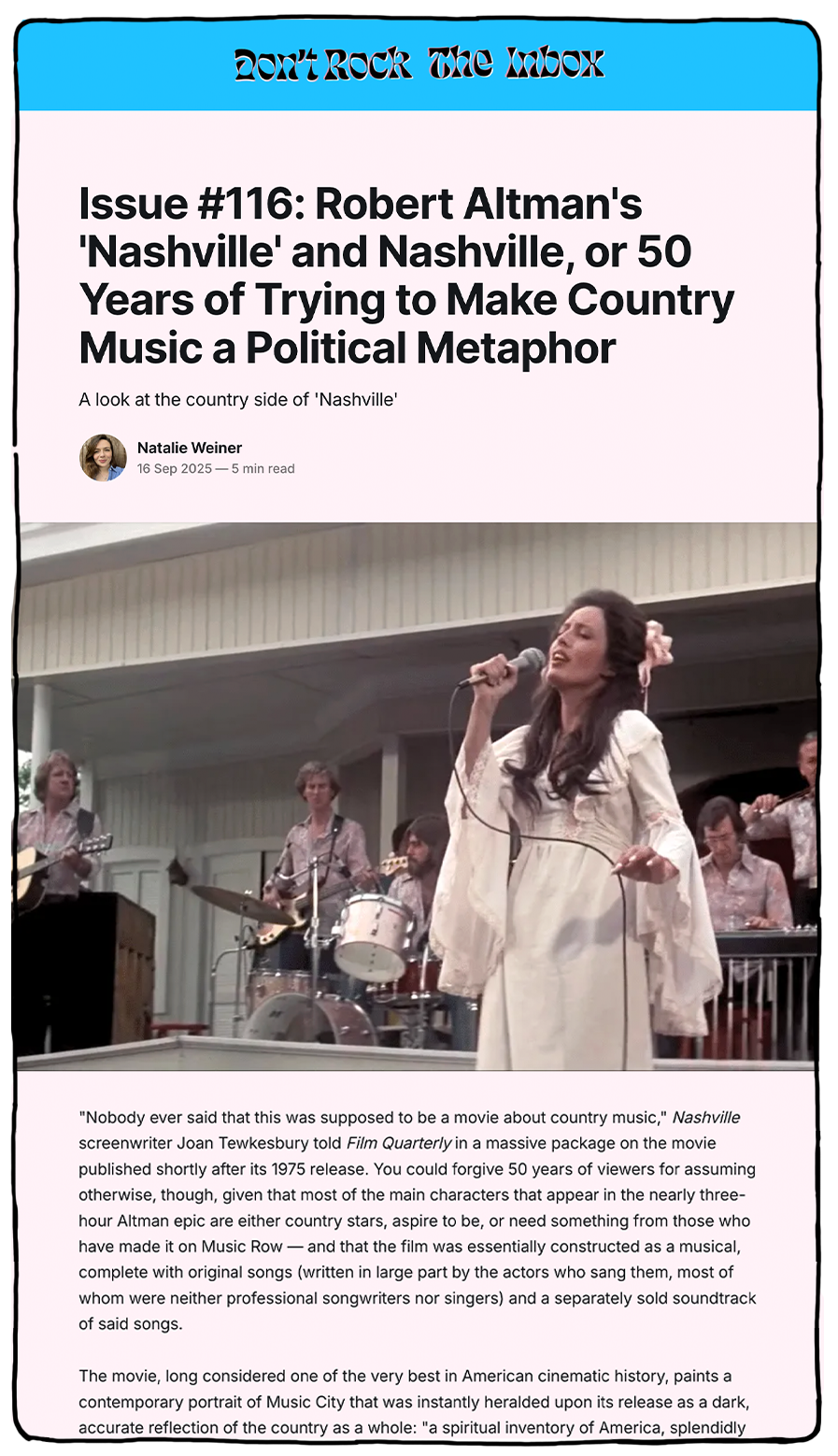If you know anything about music journalists Marissa R. Moss and Natalie Weiner, you probably already know they’re some of the best country music experts in the business. Their newsletter “Don’t Rock the Inbox” was born out of frustration with the way mainstream publications often cover country music and Americana. They’re telling the stories they want to tell, along with putting together some killer playlists. — BS