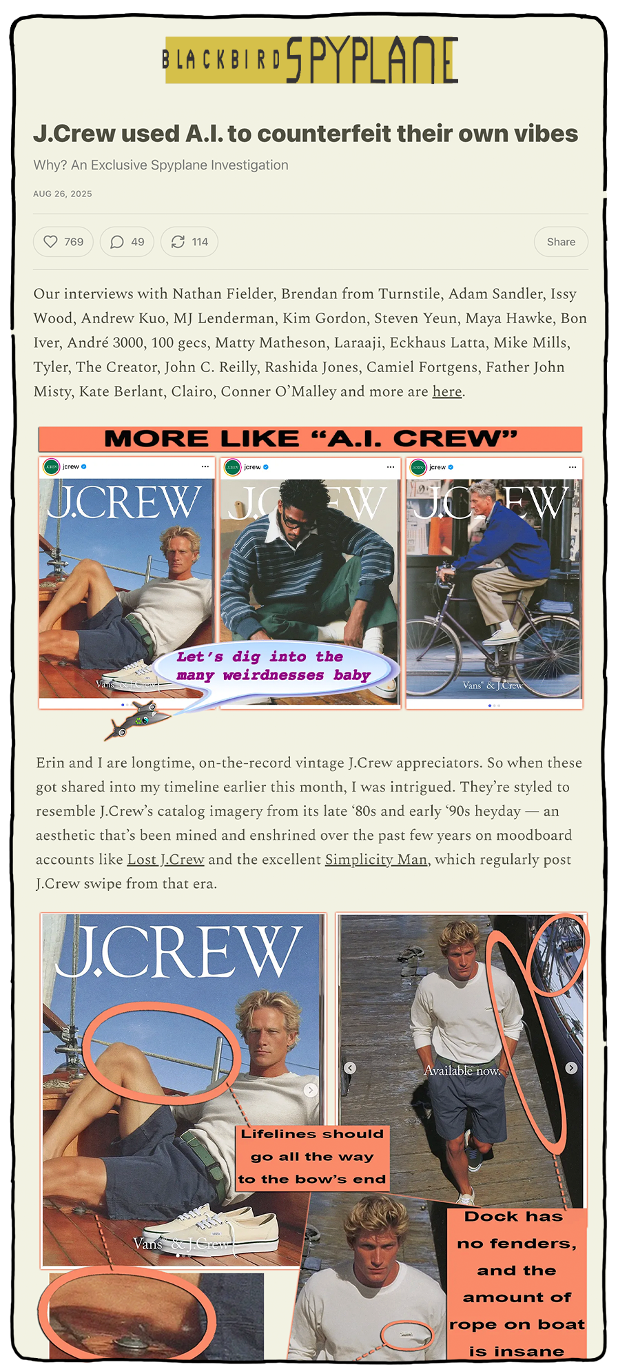 With an ultra-stylized voice and a slate of subject material that ranges from thinkpieces about the blessed nature of aubergine-colored clothing to full-blown investigative journalism on J.Crew’s recent AI-spawned advertisements, culture savants Jonah Weiner and Erin Wylie’s Blackbird Spyplane might sound a touch recreational, but don’t underestimate the surprisingly profound insight in physical ephemera that this newsletter is able to provide…it’s the “unbeatable recon” on little-known but worthwhile brands. — PS