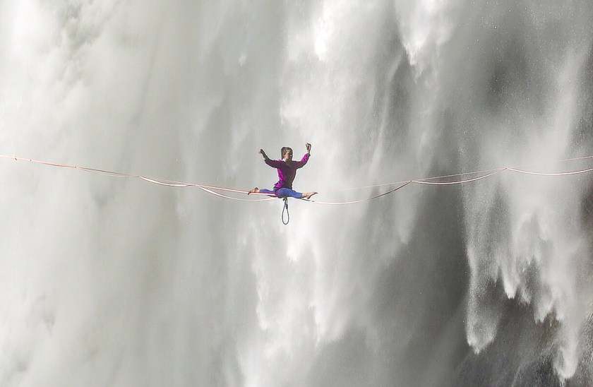 Don’t look down. In these photos, you can see daredevil Kimberly Weglin, 23, doing yoga on a 420-foot slackline about 150 feet above the ground—directly in front of Vernal Fall in California’s Yosemite National Park. Weglin (pictured above, in the purple shirt) has been slacklining for two years and went on the daring trek with her boyfriend Ryan Jenks and pals Scott Hong, Elana Polichuk, Michael Melner, and Sara Wilson. The group is the first in history to walk that specific high-line and experience the waterfall from that perspective. Take a look at some photos of Weglin accomplishing the feat below; read Weglin’s Facebook post about it, with additional photos, here.
