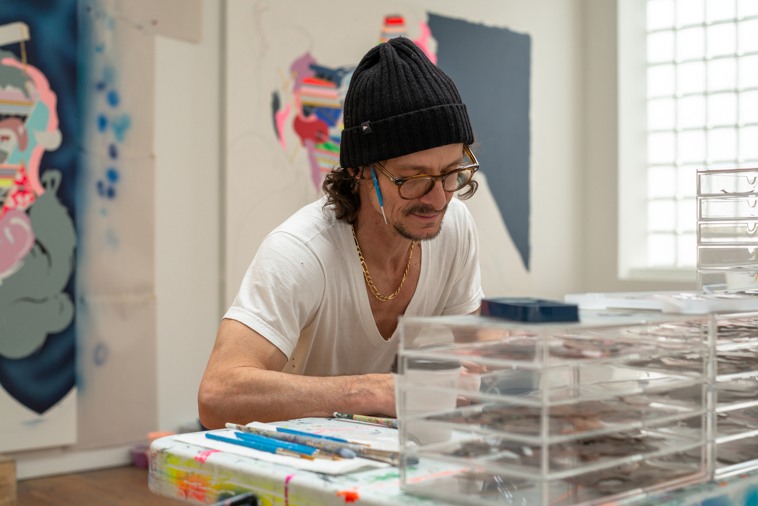 “Hot damn” reads a plastic container of neon yellow paint that’s shouting at me from a table in Erik Parker’s studio. The artist — whose work is currently in the collections of the Museum of Modern Art, Whitney Museum of American Art, Brooklyn Museum and many others — opened his Brooklyn studio to guests in time for the Frieze Art Fair in May, in partnership with Blundstone (he loves to wear the shoes before and after surfing). Parker and his team mix 95% of his colors, many of which he names himself; hence the “Hot Damn” dashed onto the container, accompanied by the likes of “Soaked” (dark, greyish purple), “King Tubby” (fluorescent red), “Fallin” (bright orange) and “Bumpin,” (light pink). There’s no rhyme or reason to the names, he says. It’s whatever jumps out at him first.