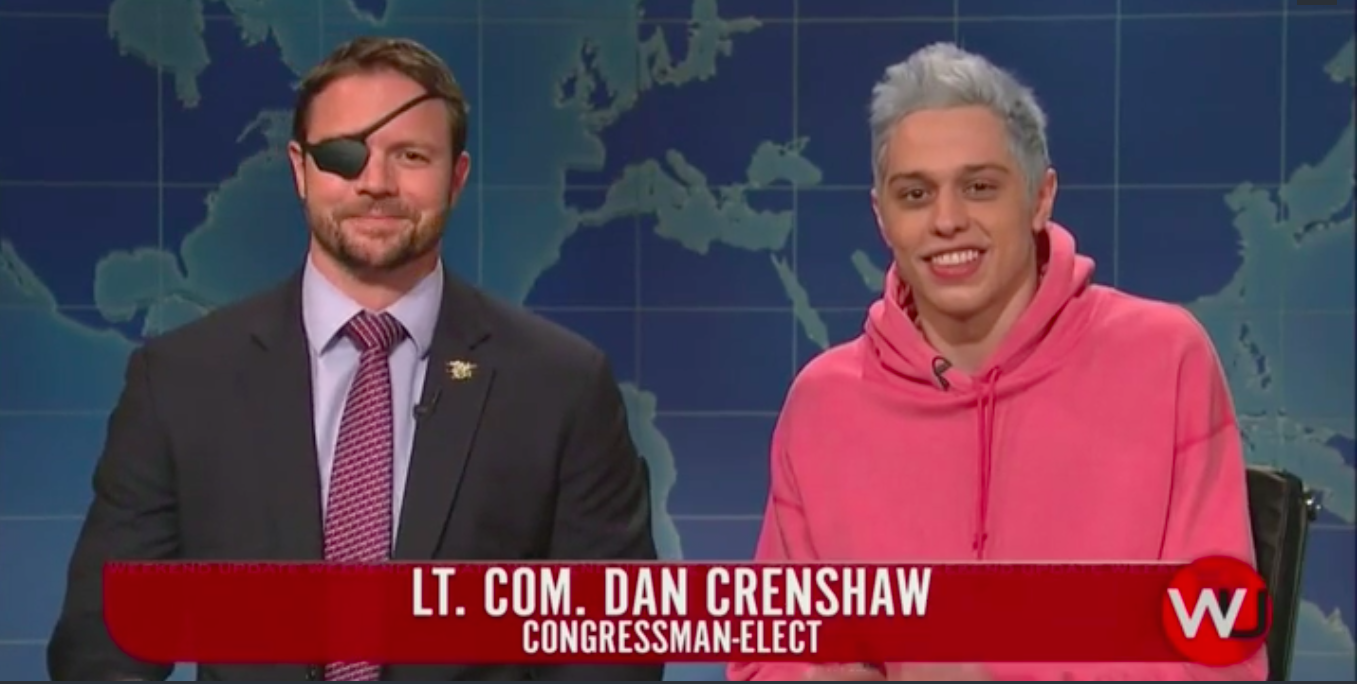 One week after Saturday Night Live cast member Pete Davidson mocked the appearance of former Navy Seal—and now newly elected Congressman—Dan Crenshaw, the latter got his payback on the show. Davidson, reacting to near universal condemnation of his remarks, appeared on “Weekend Update” segment to acknowledge his poor choice of words about Crenshaw, who lost an eye to an IED blast during his third combat tour in Afghanistan. Crenshaw then appeared alongside Davidson to accept his apology—and give Davidson a good-natured taste of his own medicine.