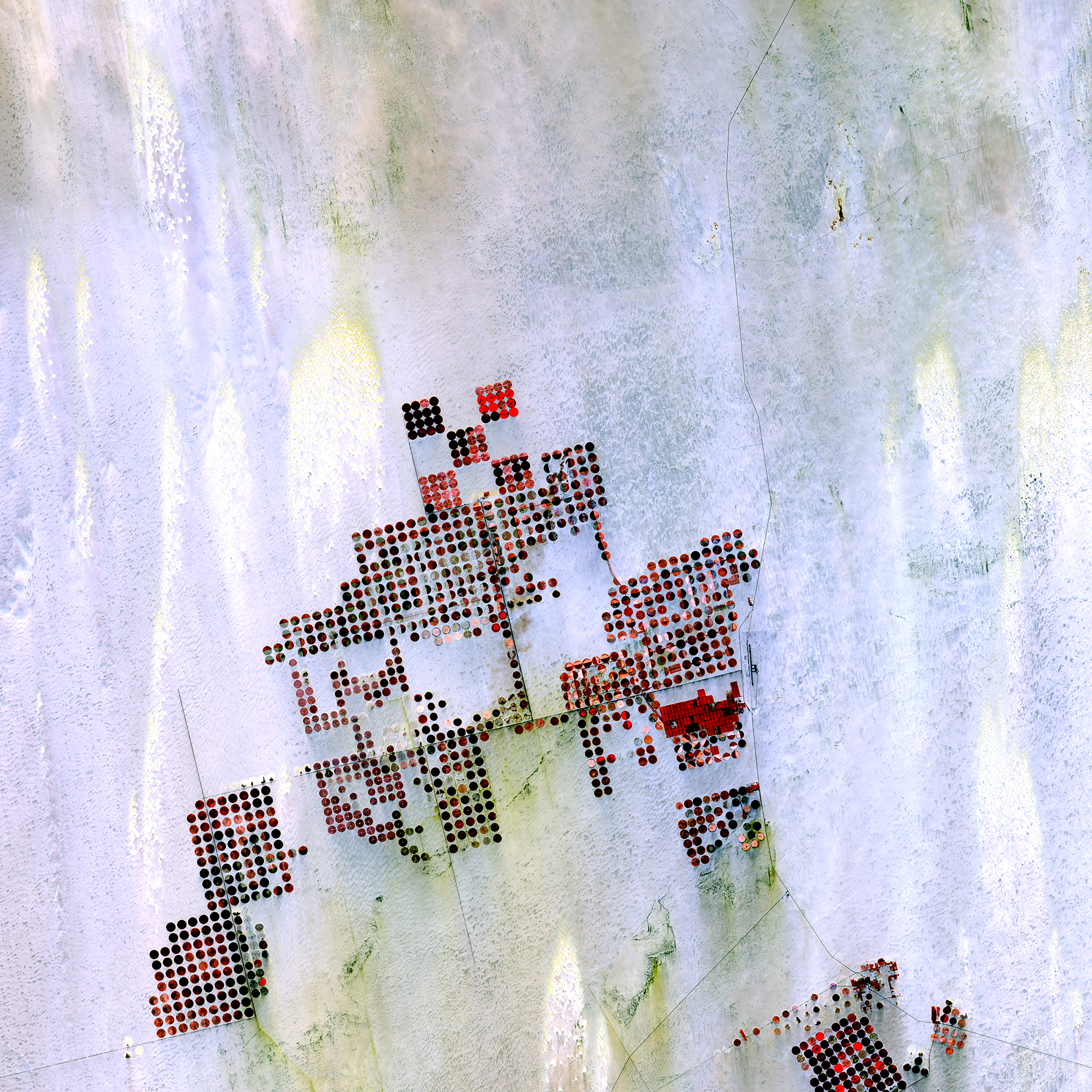 Geometric shapes lie across the emptiness of the Sahara Desert in southern Egypt. Each point is a center pivot irrigation field a little less than 1 kilometer (0.6 mile) across. With no surface water in this region, wells pump underground water to rotating sprinklers from the huge Nubian Sandstone aquifer, which lies underneath the desert. (USGS/NASA)