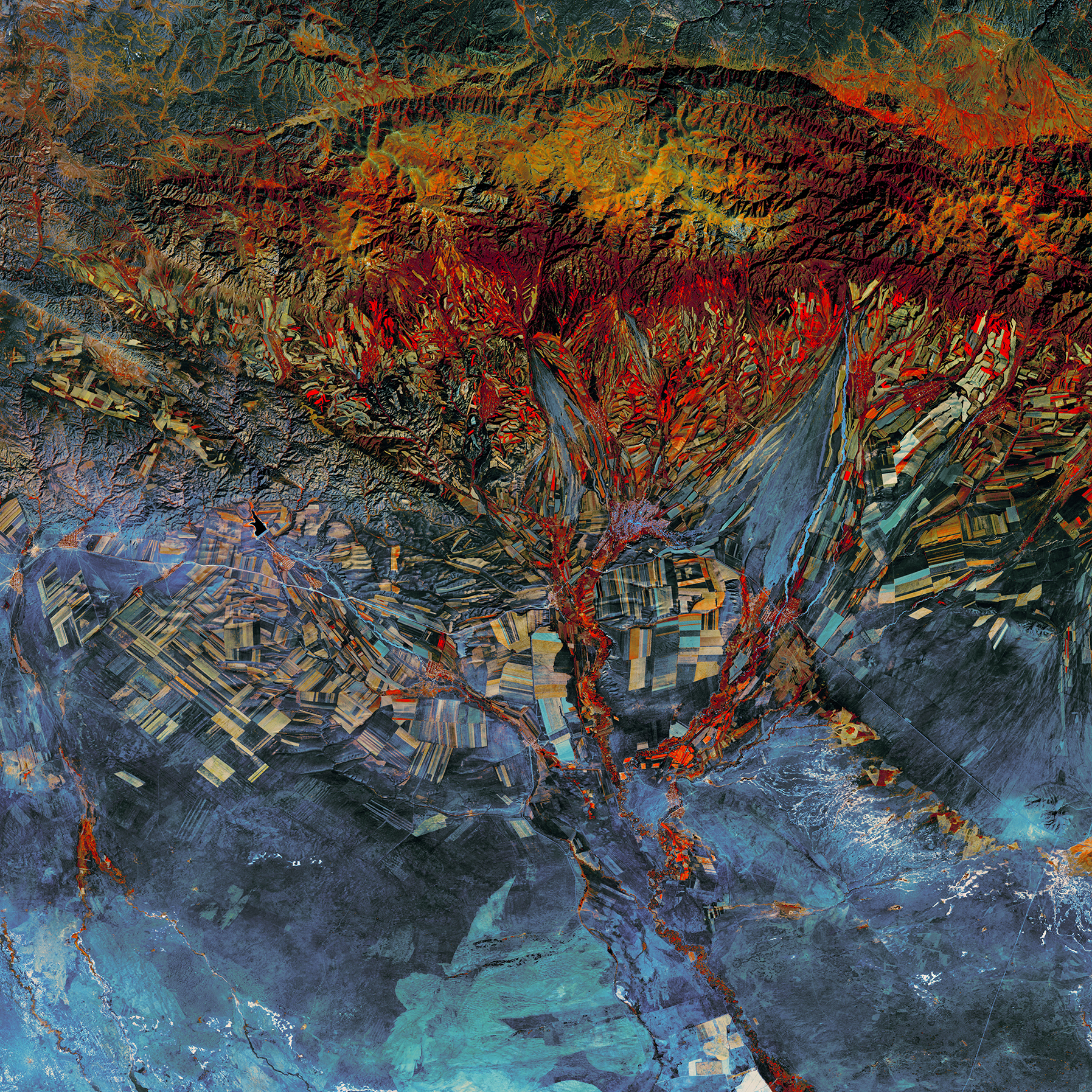Startling red patches sprout from an agricultural landscape that looks almost like a Cubist painting. The fields in this part of eastern Kazakhstan follow the contours of the land—long and narrow in mountain valleys, and large and rectangular over the plains. (USGS/NASA)