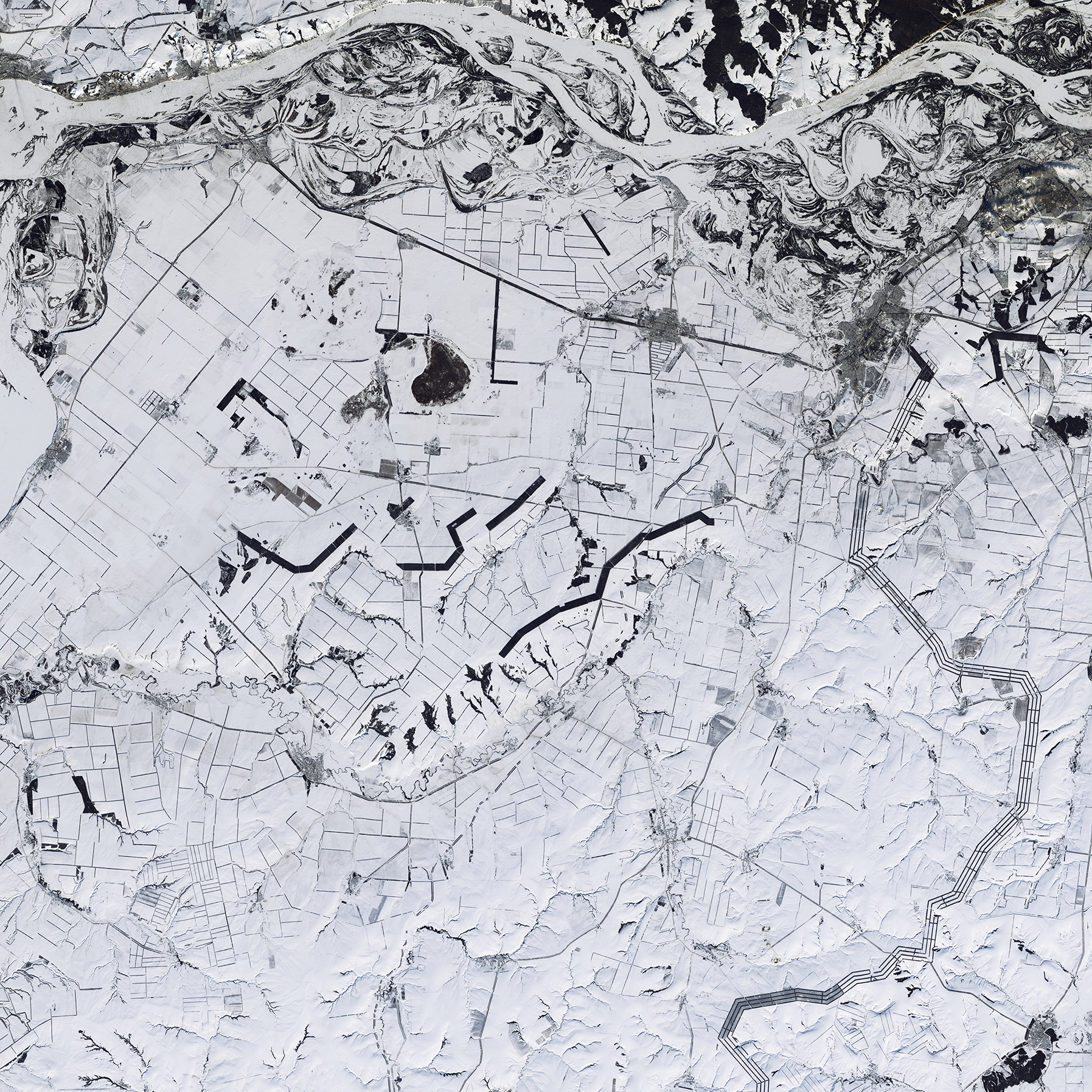 Is this a black-and-white image? No, this is a natural color image of snow-covered southwestern Russia. Windbreaks, roads, and fence lines look like random pencil marks near the Volga River, which flows across the top of the image. The thick lines are trees planted to protect fields from dry wind and erosion; these windbreaks retain snow, allowing more moisture to penetrate into the soil. (USGS/NASA)