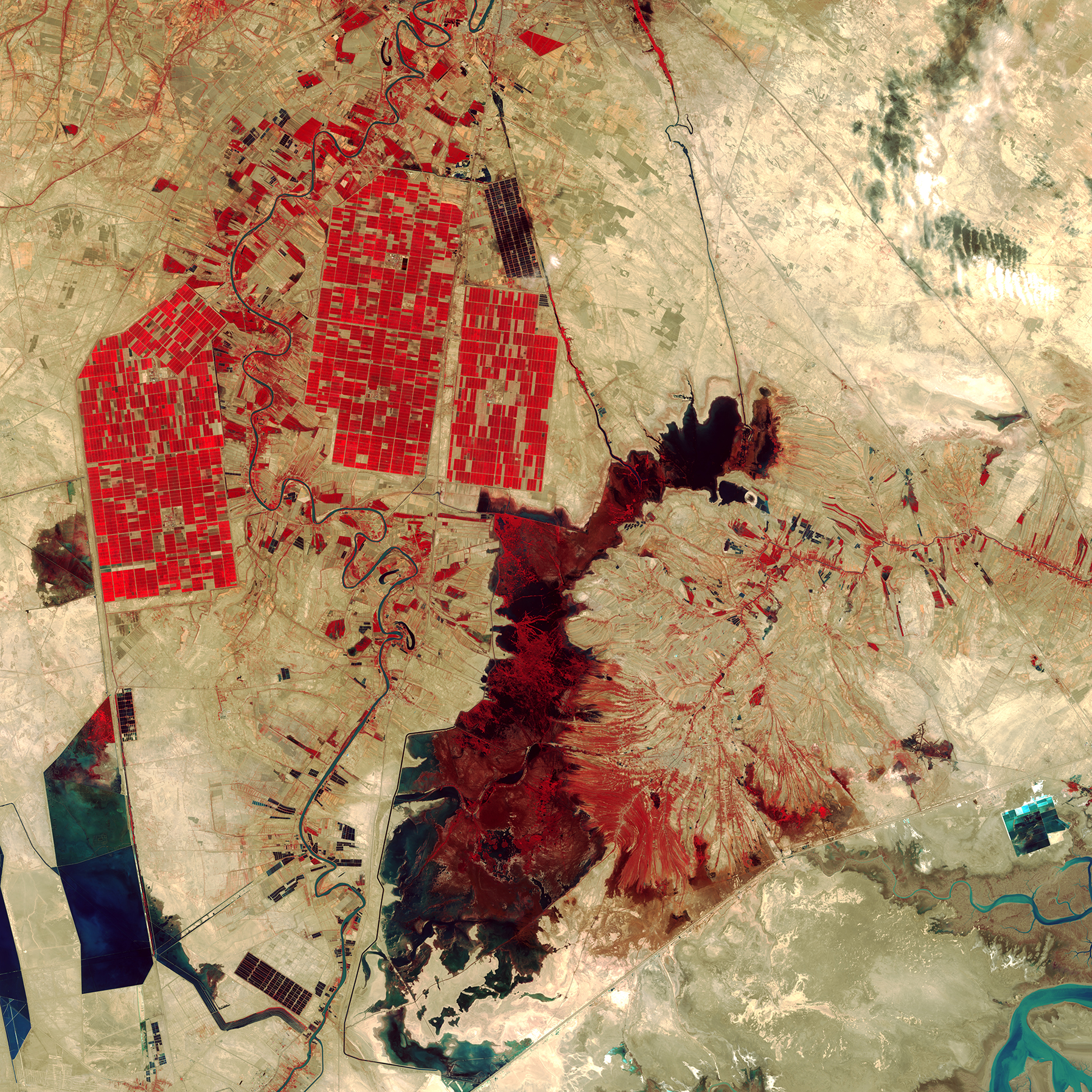 What appear to be smatterings of paint on a wall represent an amalgam of human-made and natural features in southwestern Iran. The dark red shape in the center of the image is Shadegan Pond, which is the northern part of the larger Shadegan Wetlands. Red areas depict actively growing vegetation, and the rectangular shapes in the upper left reveal irrigated farmland.(USGS/NASA)
