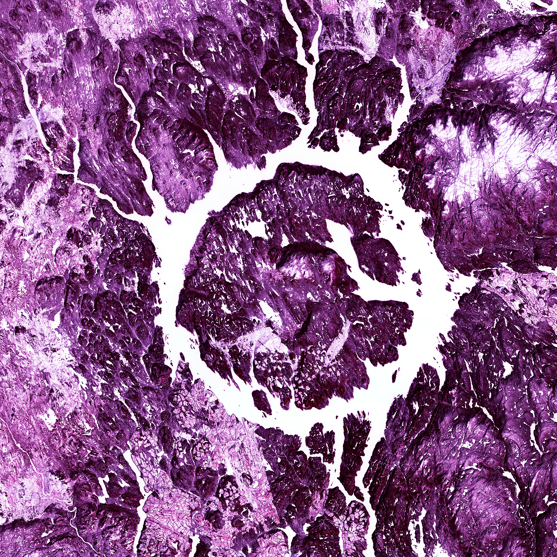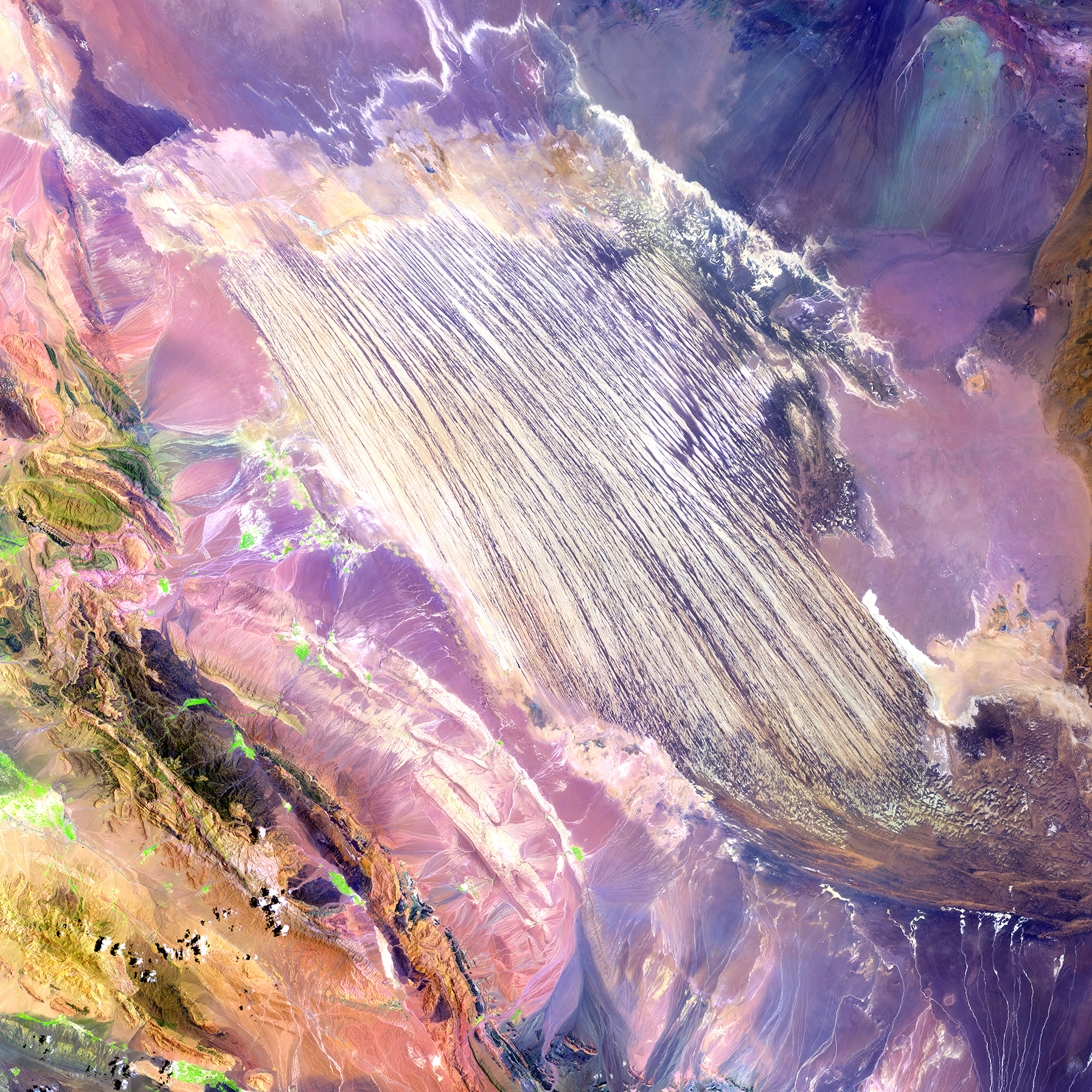 A bold paint stroke on a busy purple canvas is actually part of the Dasht-e Lut Desert in southeastern Iran. The linear features are kaluts, huge rocky formations shaped by wind erosion. The streamlined forms vary in size, but some kaluts stretch more than 100 kilometers (62 miles). (USGS/NASA)