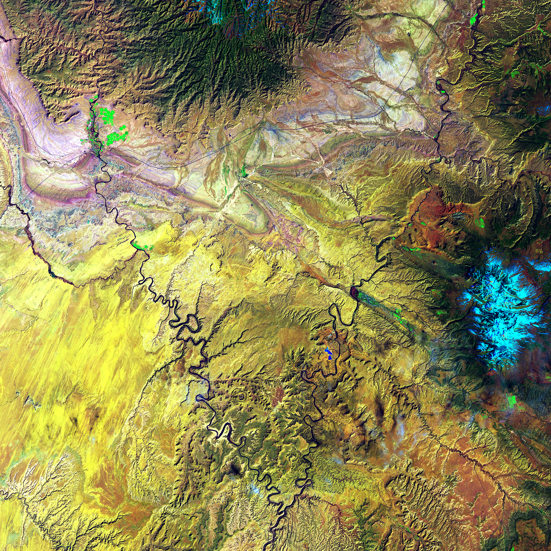 The Green River and the Colorado River meet within Canyonlands National Park in Utah. Snow-covered Mount Waas, shown in light blue on the right side of the image, overlooks the arches, canyons, and bizarre rock formations that prevail throughout this region. (USGS/NASA)