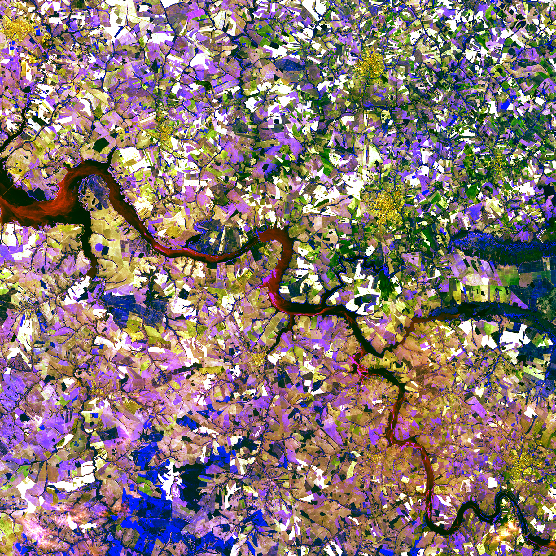 The Tietê River snakes across this tessera mosaic of multicolored shapes near Ibitinga, Brazil. Fields of sugarcane, peanuts, and corn vary in their stages of development. Lavender, purple, and bright blue indicate actively growing crops. Light yellow or white indicate little or no vegetation growth. The splotches of dark mustard yellow are urban areas. (USGS/NASA)