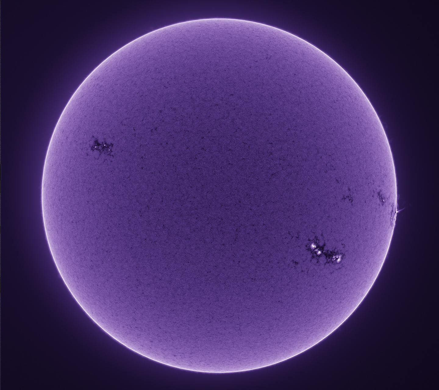 Ghostly Sun- The Sun photographed in Calcium-K light, depicting the star’s inner chromosphere. In the colour-rendering scheme used, the surface is shown as negative, with the sunspots as bright spots, but the area outside the limb is shown with increased contrast, highlighting a surge on the western limb, and several small prominences. Although the Sun is shown entering a quieter phase, a lot of activity is still taking place, illustrating just how dynamic our star is. Groningen, Netherlands (© Michael Wilkinson)