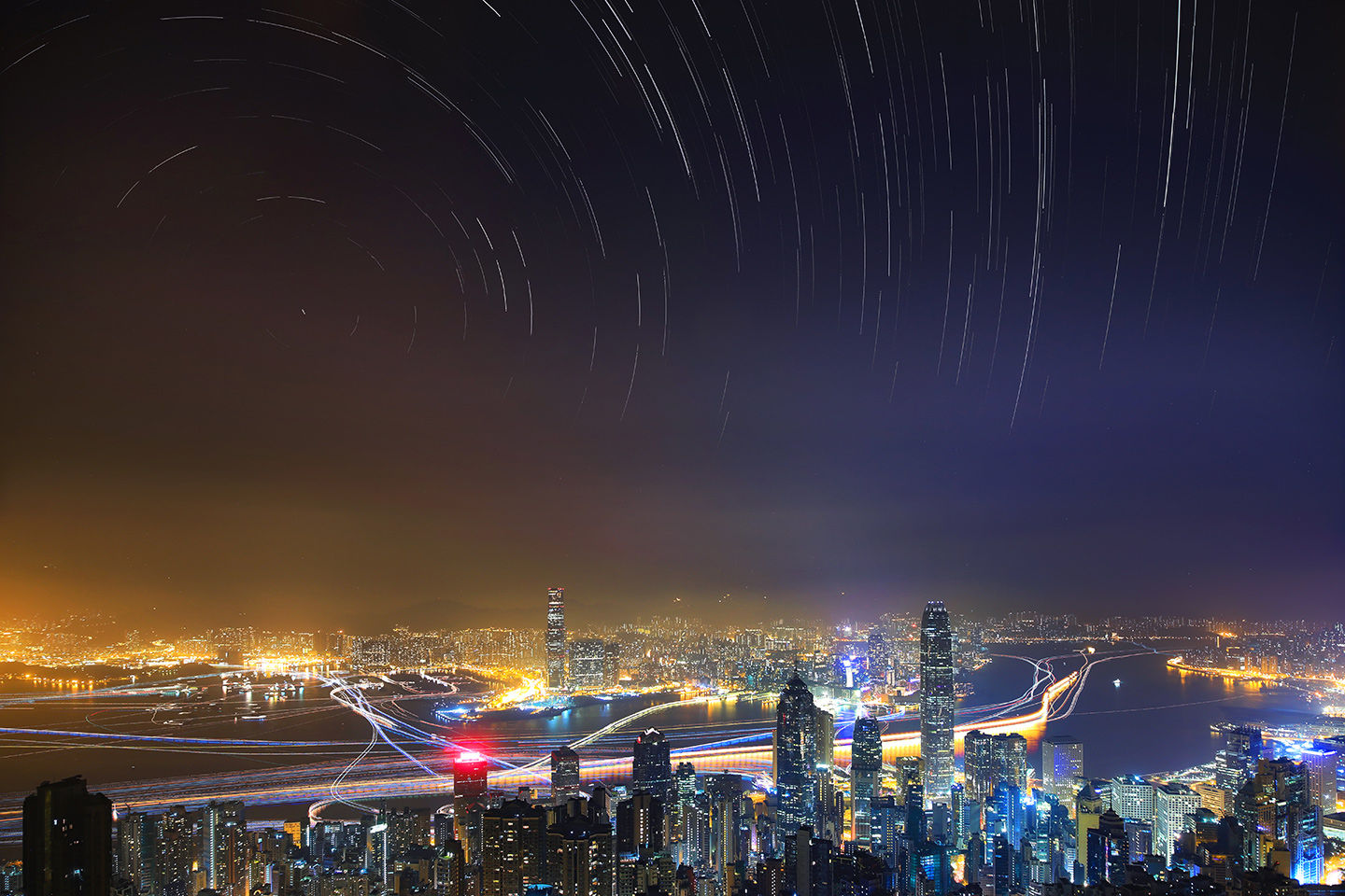 Hustle and Peaceful- Taken from The Peak, the highest mountain on Hong Kong Island, the image shows the hustle and bustle of the city in contrast to the peaceful starry sky. The haze above the beautiful landscape reminds us that light pollution prevents us from enjoying an even more stunning sky view. Along the coastline the sharp, vibrant light signifies the fast-paced life of cities that many of us have become accustomed to.