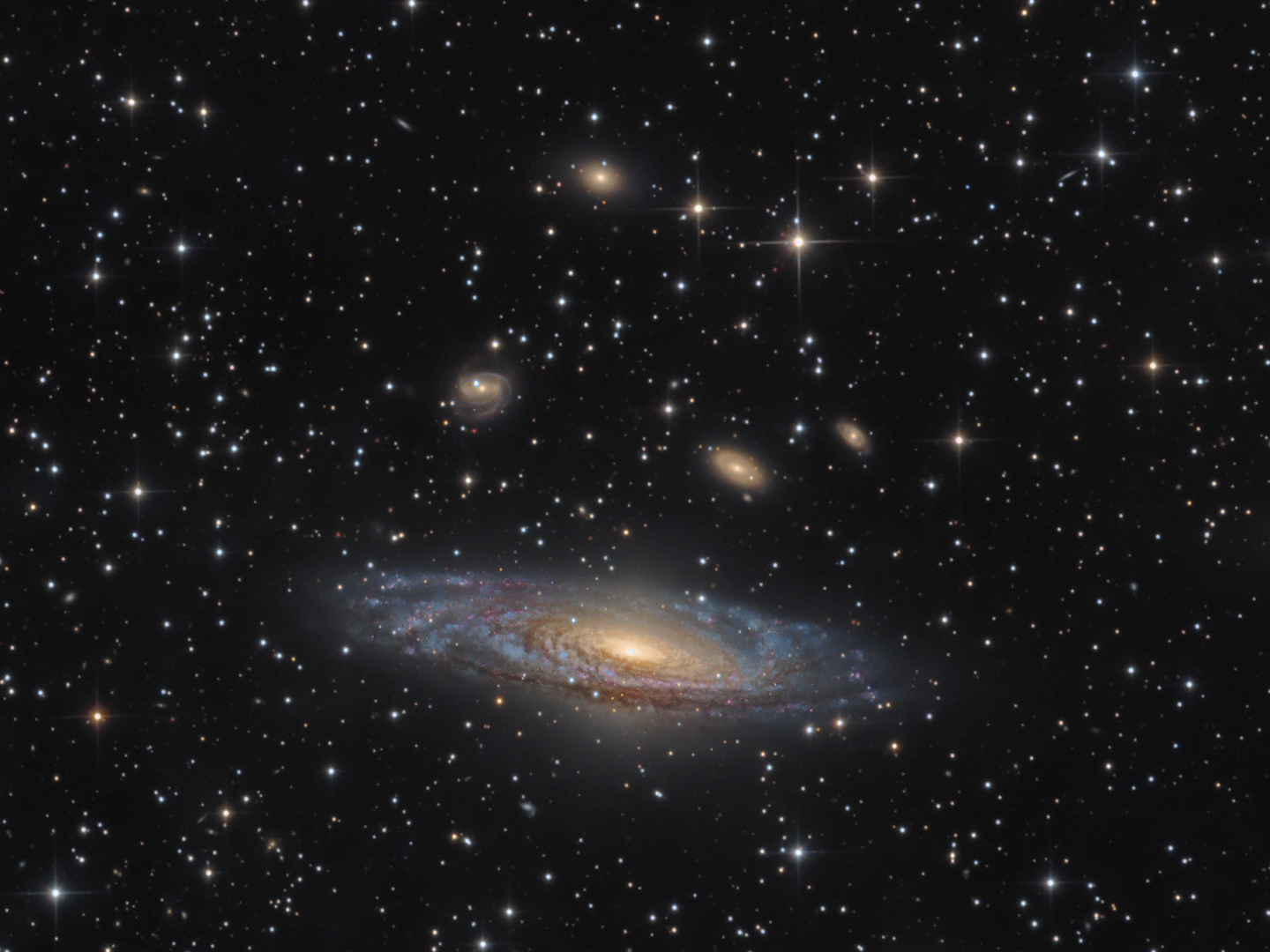NGC 7331: The Deer Lick Group- NGC 7331 is an unbarred spiral galaxy found some 40 million light years away from Earth, in the constellation Pegasus. Of the group of galaxies known as the Deer Lick Group, NGC 7331 is the largest, and can be seen dominating the image whilst the smaller galaxies NGC 7335, NGC 7336, NGC 7337, NGC 7338 and NGC 7340 drift above it. Animas, New Mexico, USA (© Bernard Miller)