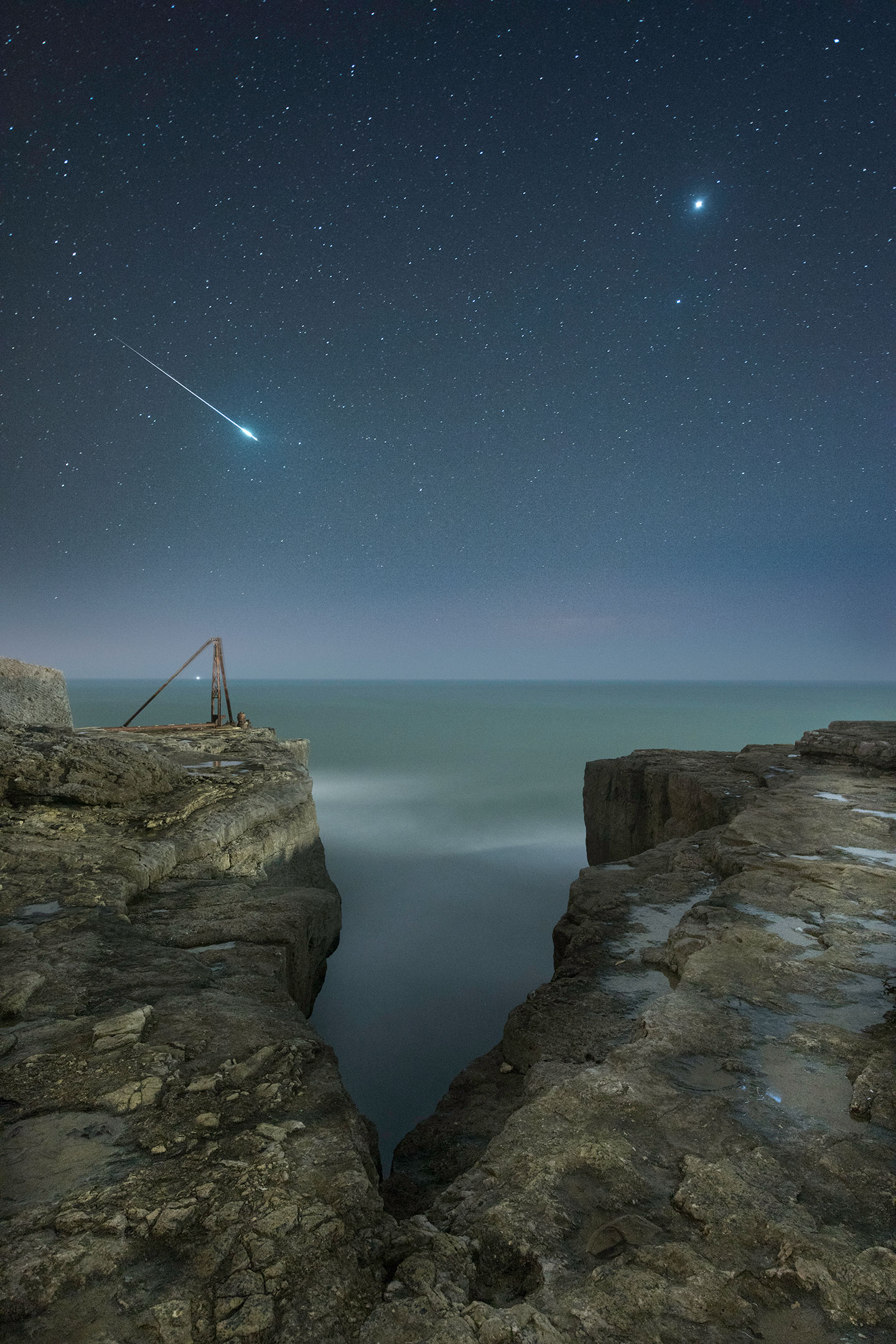 Shooting Star and Jupiter- A shooting star flashes across the sky over the craggy landscape of Portland, Dorset, as the planet Jupiter looks on. The image is of two stacked exposures: one for the sky and one for the rocks. Portland, Dorset, UK (© Rob Bowes)