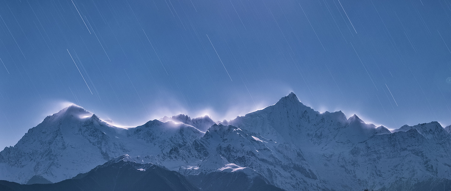 Star Track in Kawakarpo- The stars beam down on to the Meili Snow Mountains, also known as the Prince Snow Mountains – the highest peaks in the Yunnan Province, China. It is world-renowned for its beauty and is one of the most sacred mountains in Tibetan Buddhism. The moonlight striking the top of the mountains appears to give them an ethereal quality. DeQin, Yunnan Province, China (© Zhong Wu)