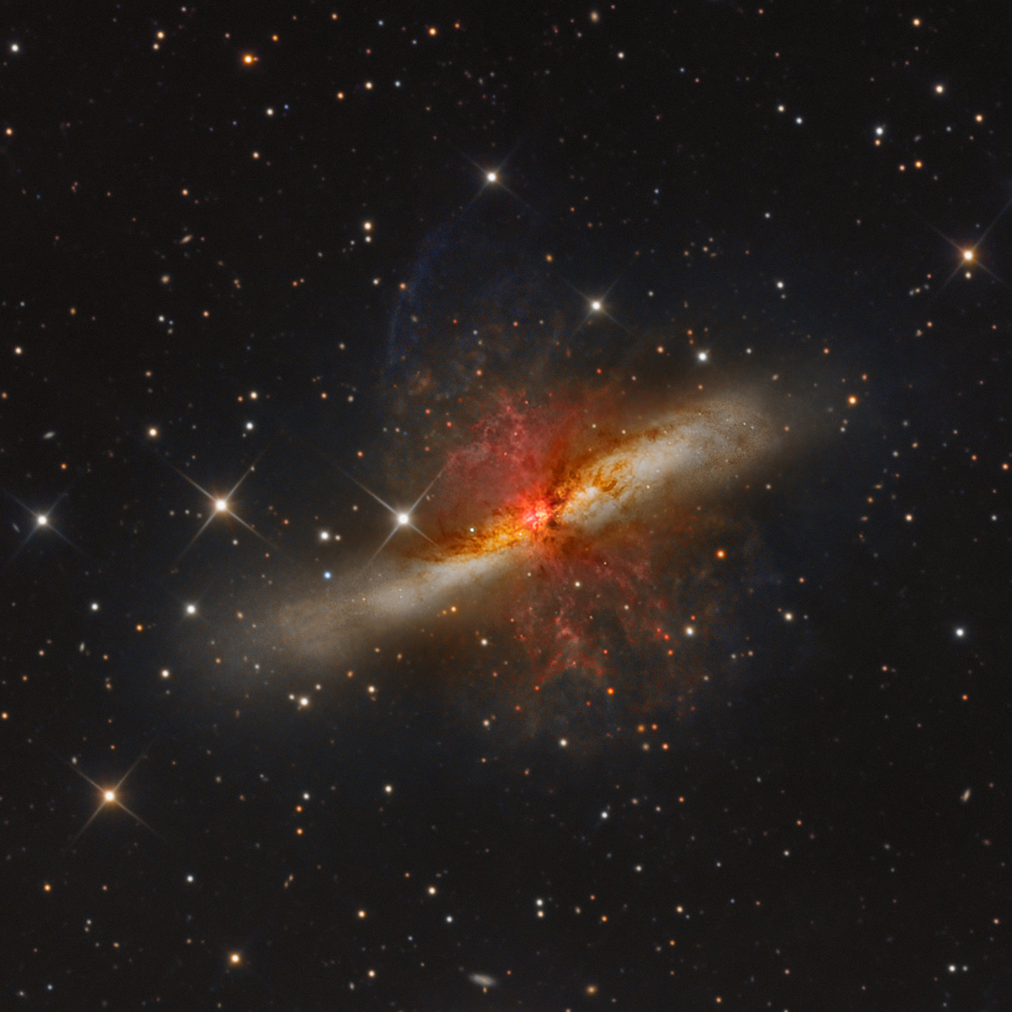 Starburst Galaxy M82- The starburst galaxy M82, also known as the Cigar Galaxy, gleams five times brighter than our galaxy lies some 12 million light years away from Earth in the constellation of Ursa Major. In a show of radiant oranges and reds, the superwind bursts out from the galaxy, believed to be the closest place to our planet in which the conditions are similar to that of the early Universe, where a plethora of stars are forming. Animas, New Mexico, USA (© Bernard Miller)