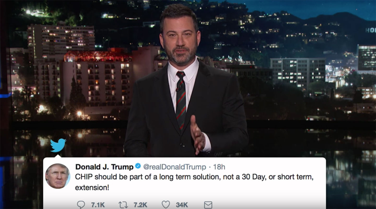 Comedian Jimmy Kimmel told viewers Thursday night that when it comes to health care, there’s one thing that he and President Trump agree on: The Children’s Health Insurance Program (CHIP) shouldn’t be utilized as leverage inside the Republicans’ spending bill. The president tweeted earlier this week that CHIP should be “part of a long term solution,” not a short term one.