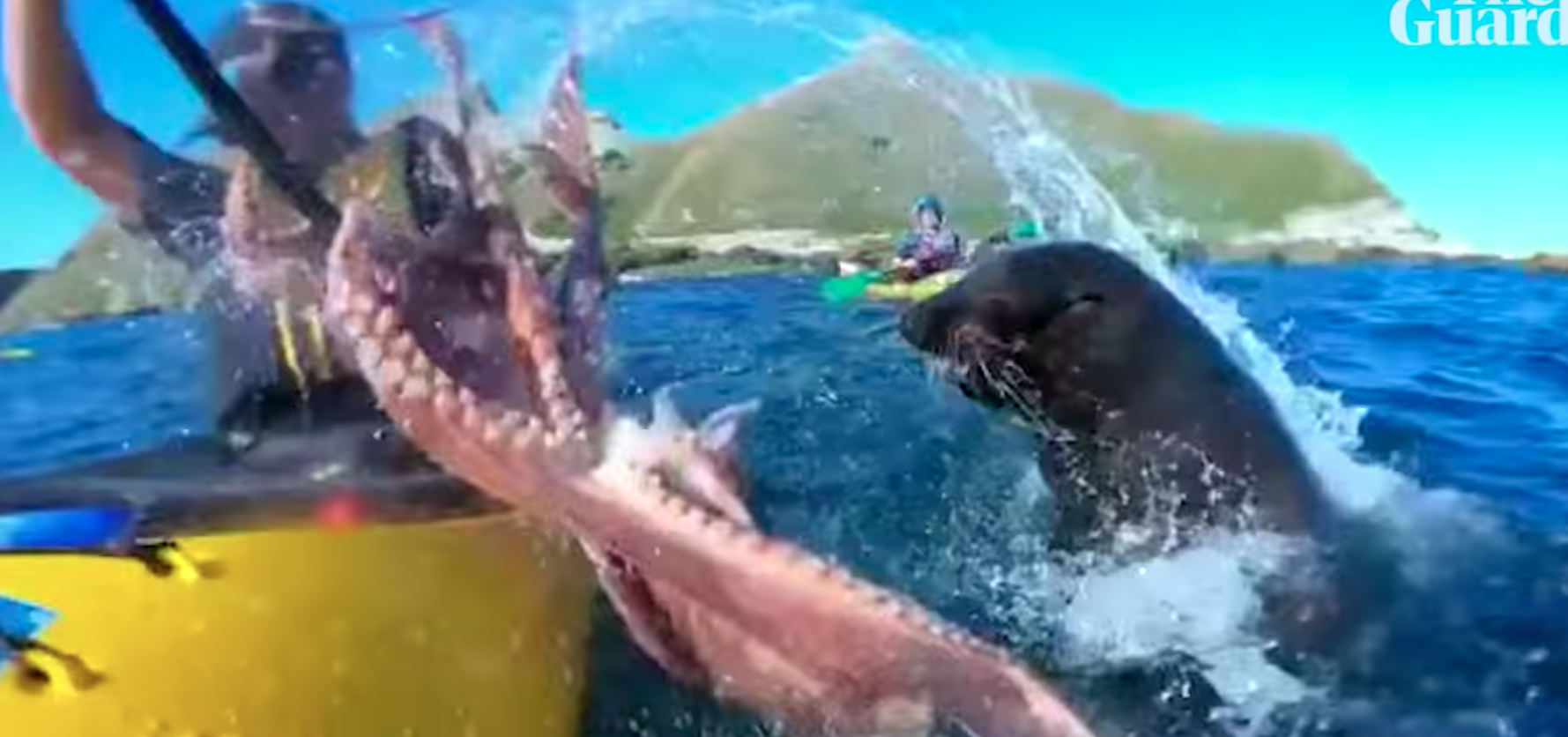 A kayaker paddling around the waters in New Zealand had the rare experience of getting hit in the face with an octopus, which was being held in the mouth of a seal.