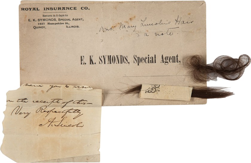 In Heritage Auctions’ Dec. 3 “American and Political” grand format auction, there’s a curious lot that includes two locks of First Lady Mary Todd Lincoln’s dark brown hair specked with grey. The two sizable locks (see image below) accompany an envelope from an Illinois insurance company, with a short note that the locks are, indeed, Mrs. Lincoln’s. And even if you’re not a hair collector, the lot also includes a historic scrap of paper, featuring 11 words written by her husband the president and signed by him, too. (It’s worth noting that what’s keeping the lot’s minimum bid at $5,000 is the Lincoln signature, but don’t let that scare you hair collectors away from bidding on it.)