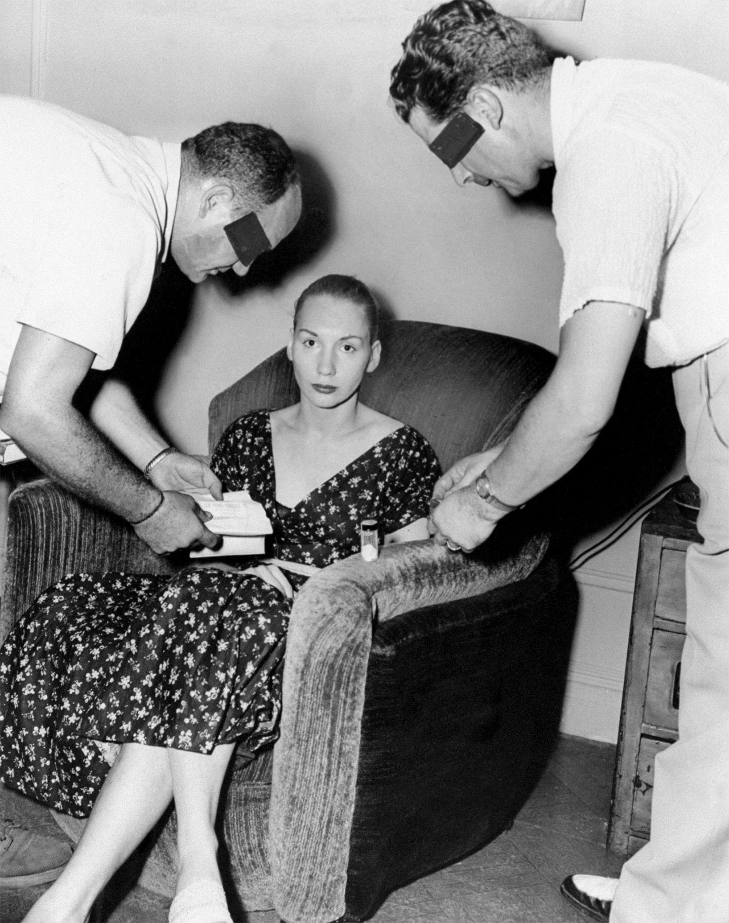 Mary Louise Truly, a.k.a. Ginger, with narcotics officers Al Spinosa and Jerry Valente after her arrest. Detectives hold Lilac-scented marijuana cigarettes that she was allegedly selling, August 06, 1954. (Tom Baffer/NY Daily News Archive via Getty Images)