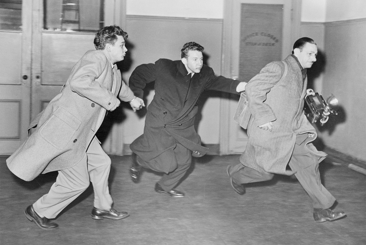Convicted muggers John Kerr and Peter Macon charge at New York Daily News photographer Phil Grietzer at the West 68th Street Precinct on Jan. 19, 1955. (NY Daily News Archive via Getty Images)