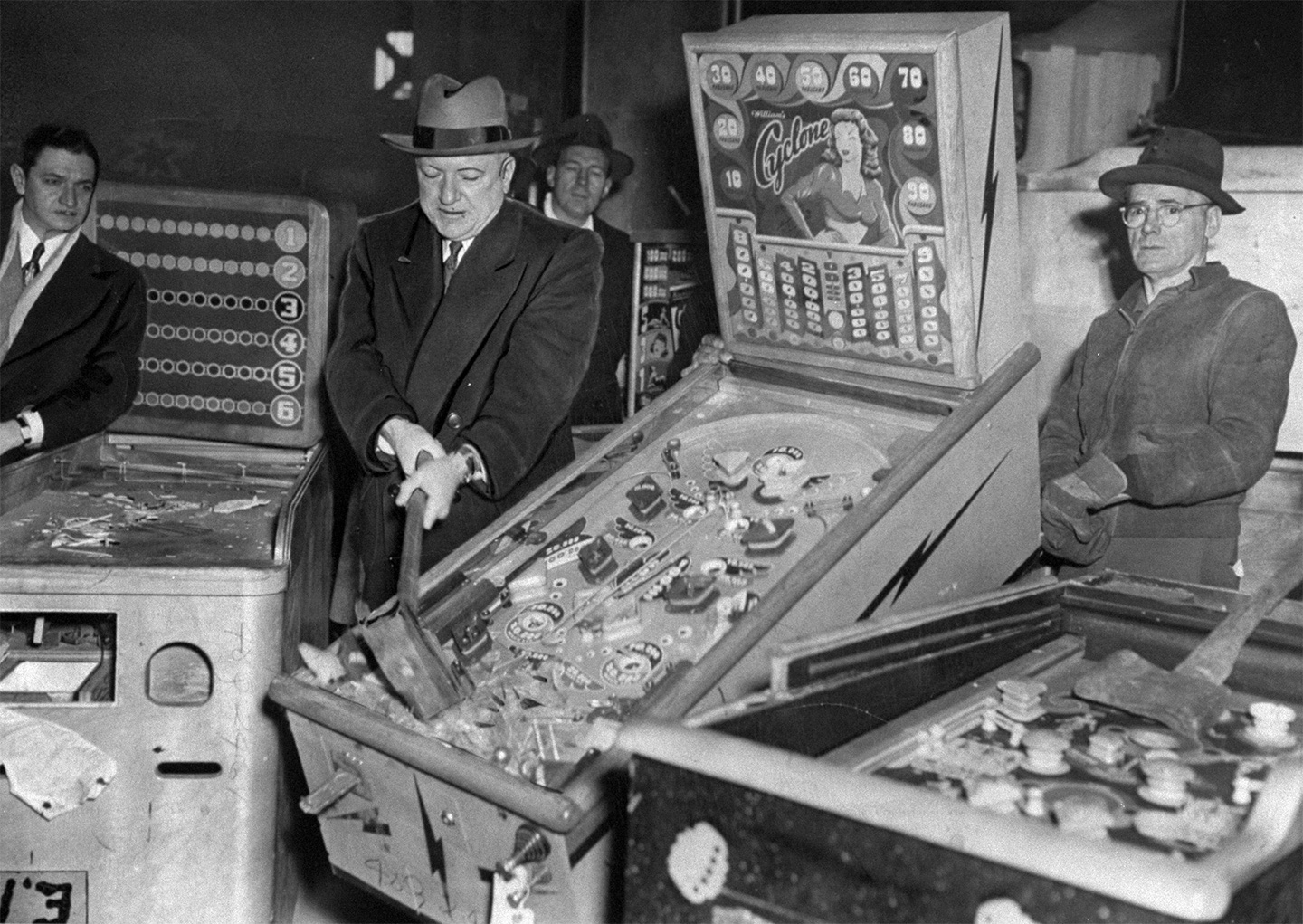 New York City Police Commissioner William P. O’Brien smashes illegal pinball machines in a warehouse in the Greenpoint section of Brooklyn, March 30, 1945. (Art Edger/NY Daily News via Getty Images)