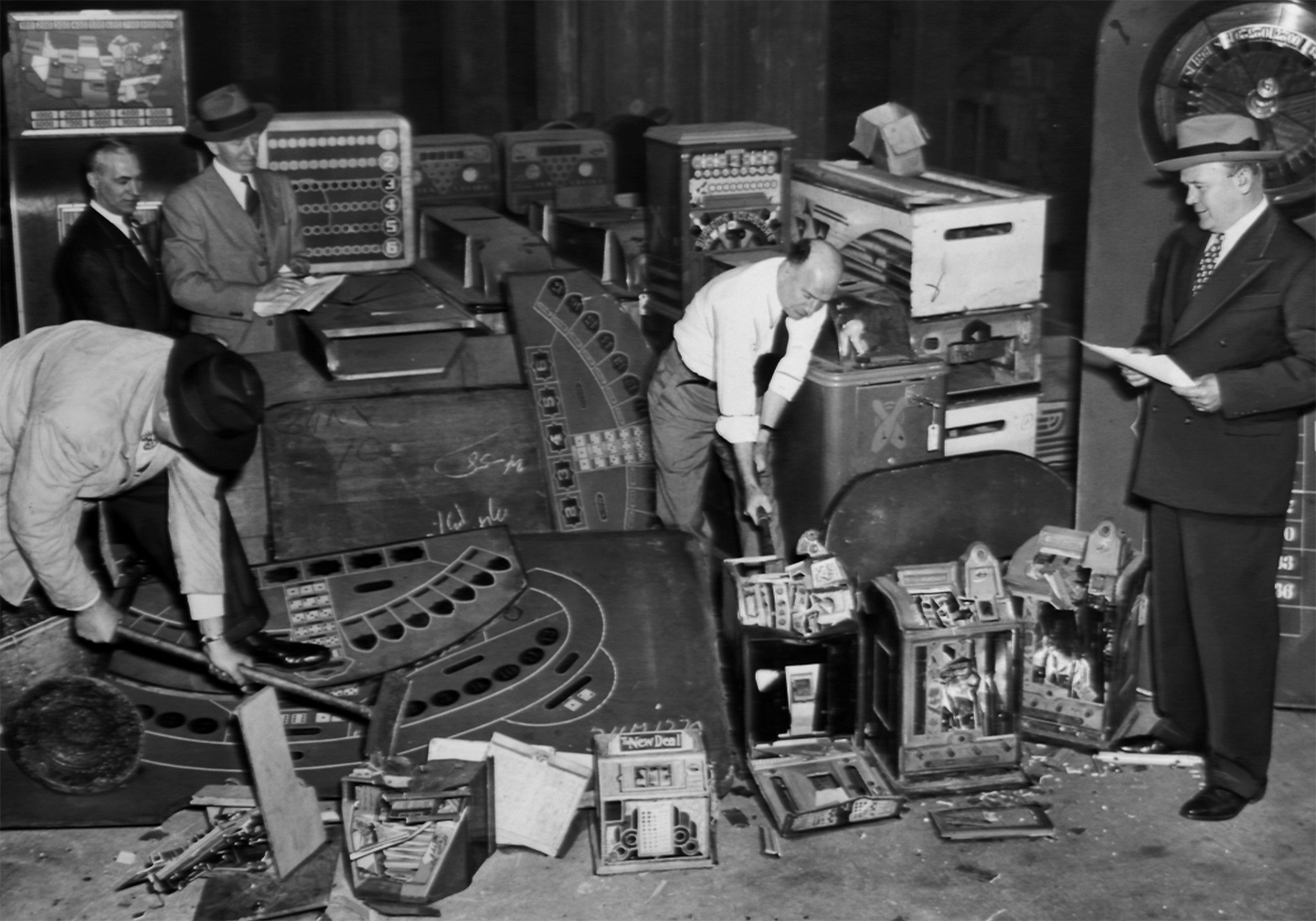 Police raid and destroy illegal gambling devices, June 23, 1948. (George Torrie/NY Daily News Archive via Getty Images)
