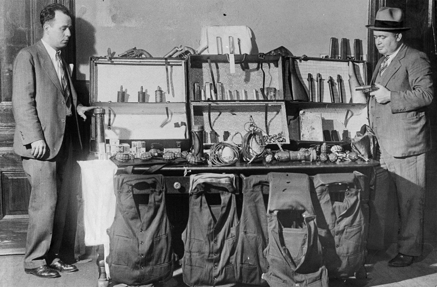 Assortment of guns, bombs, and ammunition believed to belong to Prohibition-era mobster, hitman, and bootlegger Jack ‘Legs’ Diamond. Detectives Francis McCarthy (left) and Alexander McCoregney are examining the assortment of pipe bombs, pineapple grenades, bullet proof vests, and other crime paraphernalia, October 13, 1930. (NY Daily News Archive via Getty Images)
