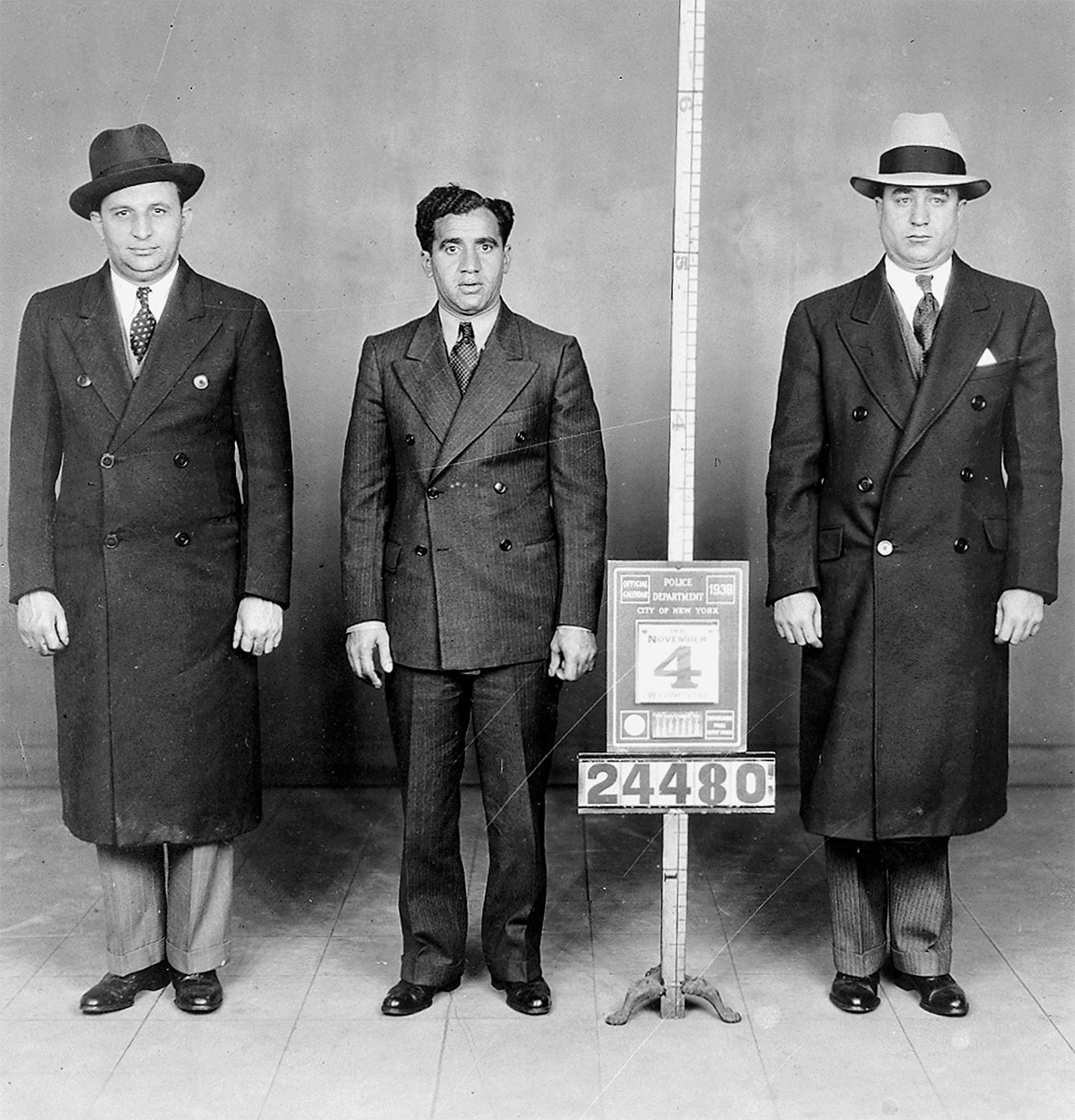 Infamous Murder, Inc. hitman Abe ‘Kid Twist’ Reles (center) in a police mug shot, November 4, 1938. (NY Daily News Archive via Getty Images)