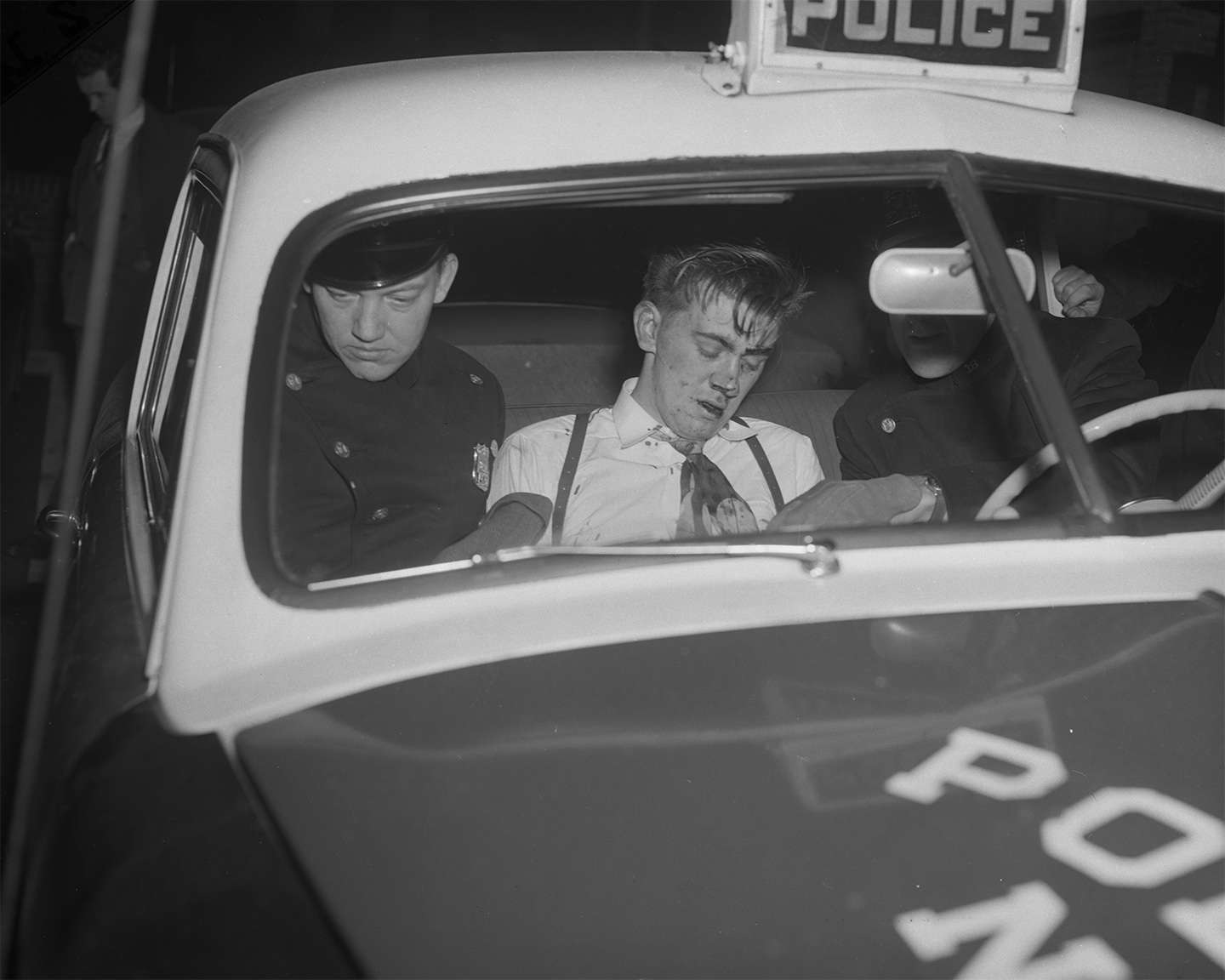 Patrolmen Rubin and Mack check robbery suspect David Perlman who was beaten while resisting arrest, November 4, 1953. (Tom Gallagher/NY Daily News Archive via Getty Images)