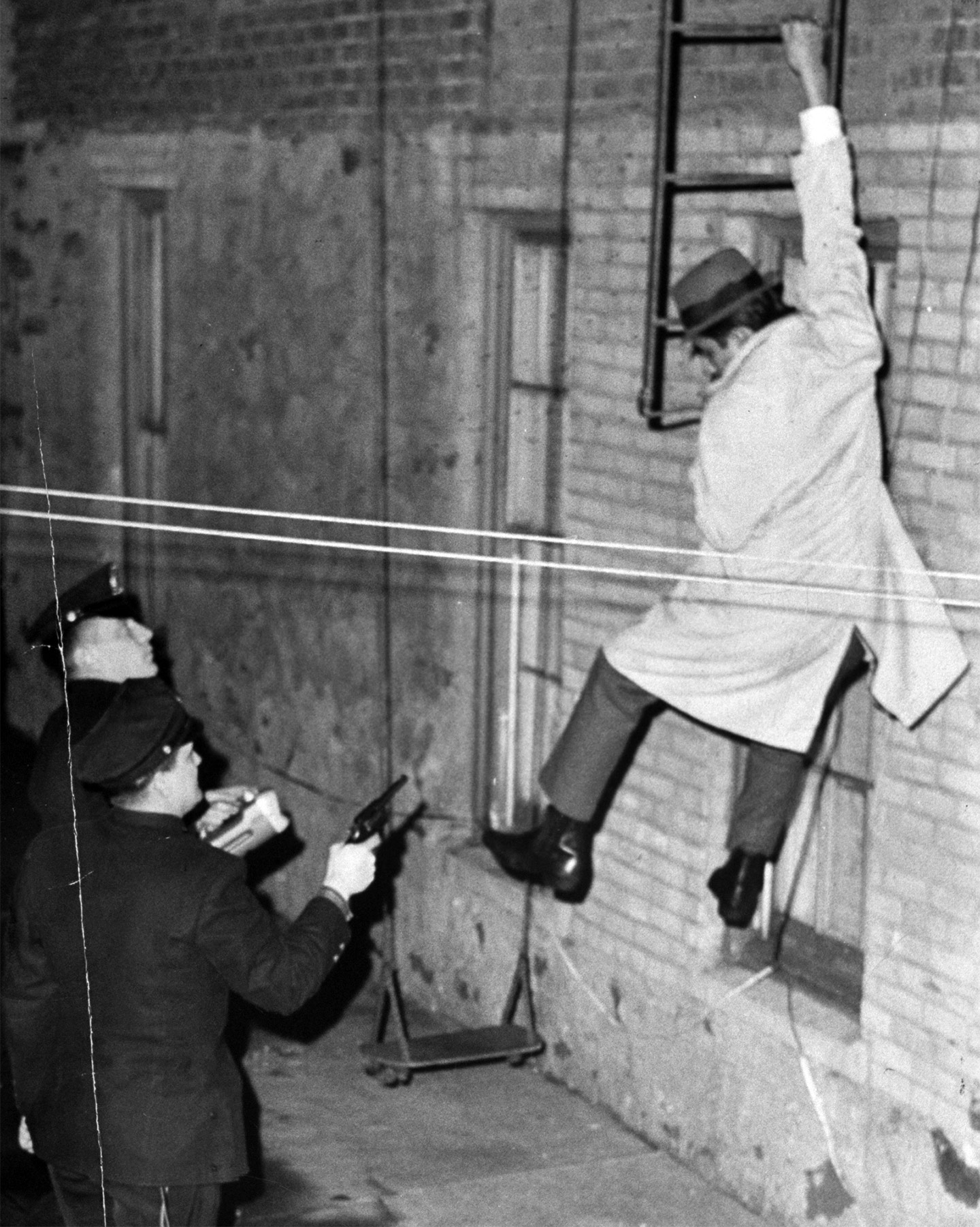 Burglary suspect is arrested by two police officers in the Bronx as he descends fire escape, December 19, 1964. (Al Aaronson/NY Daily News Archive via Getty Images)