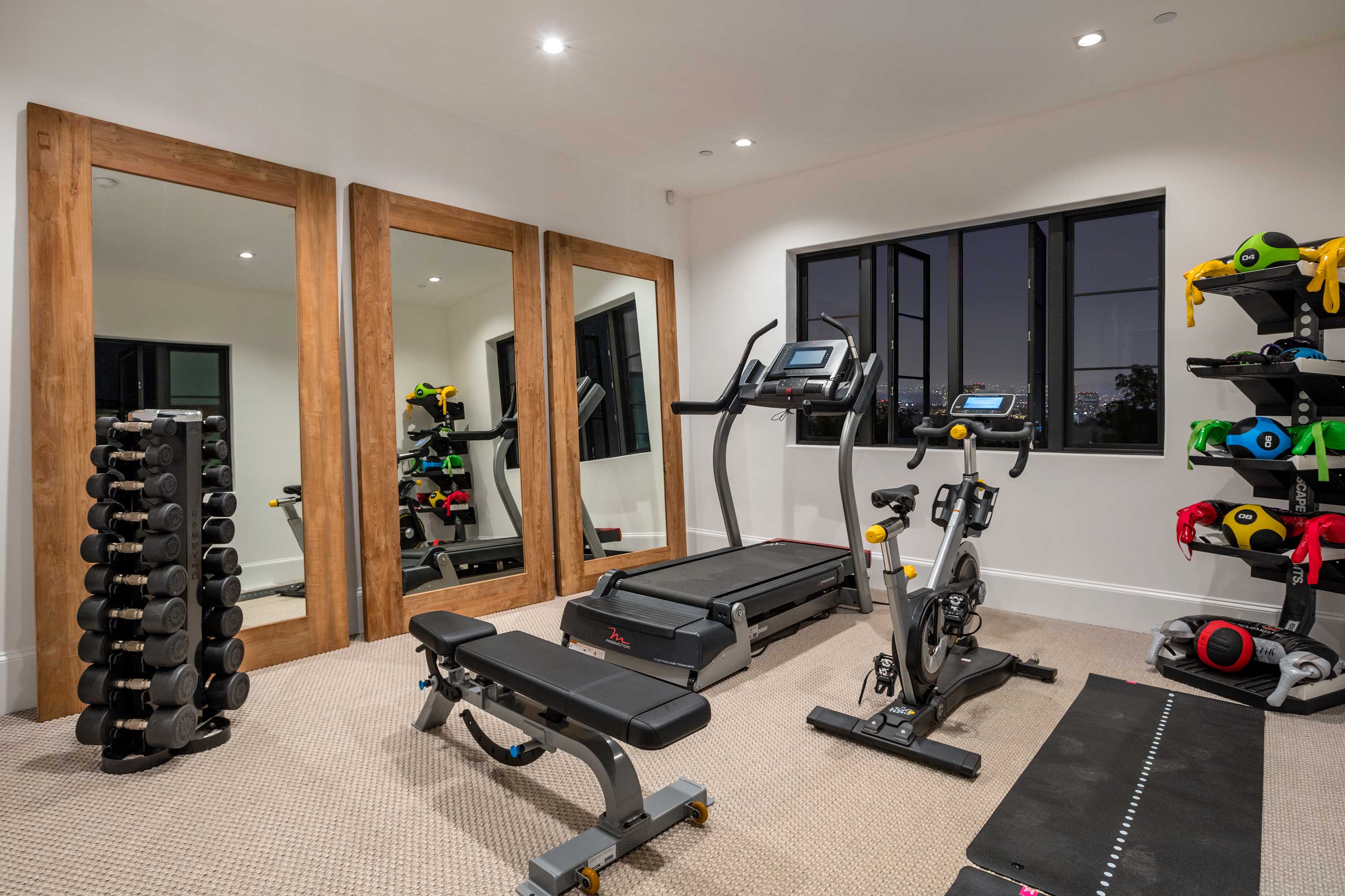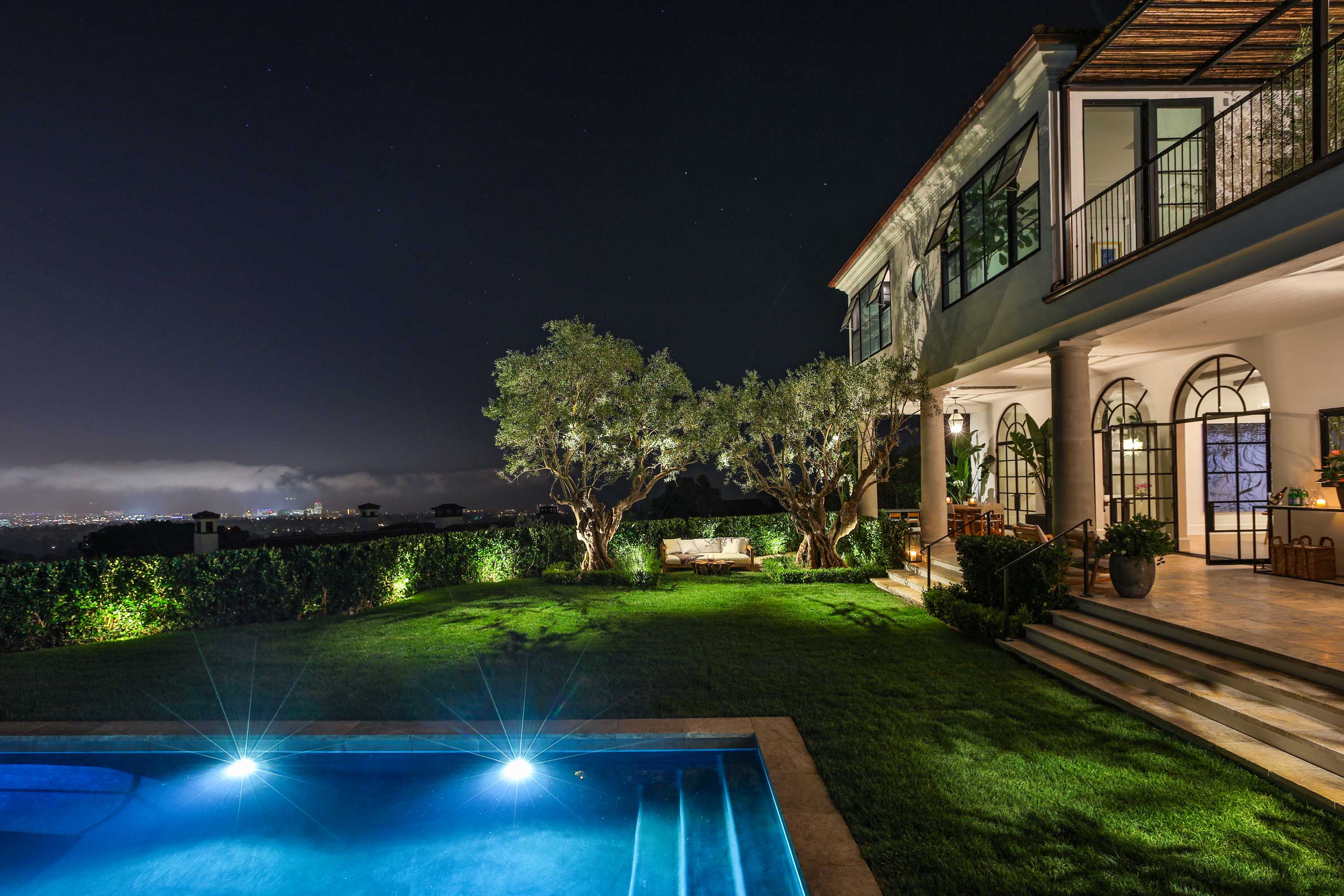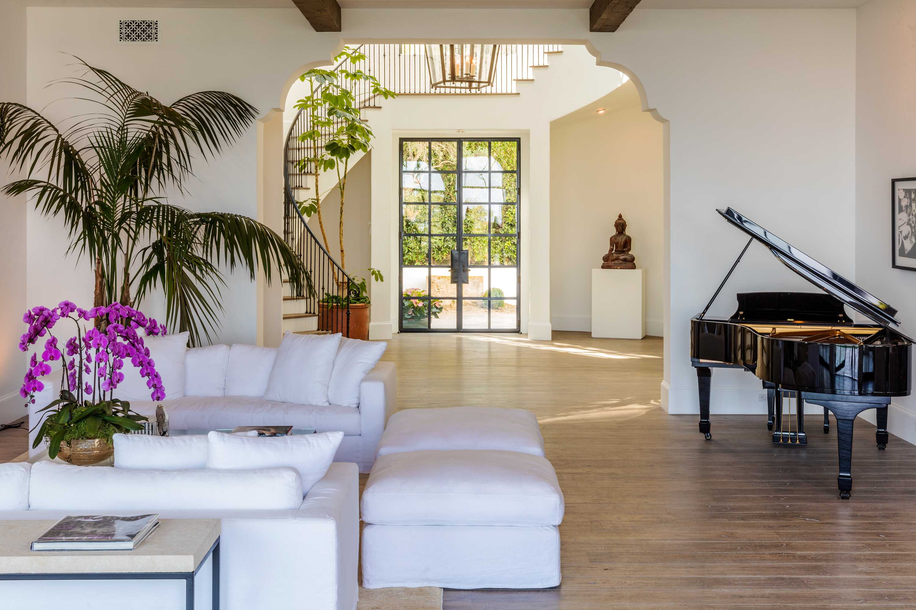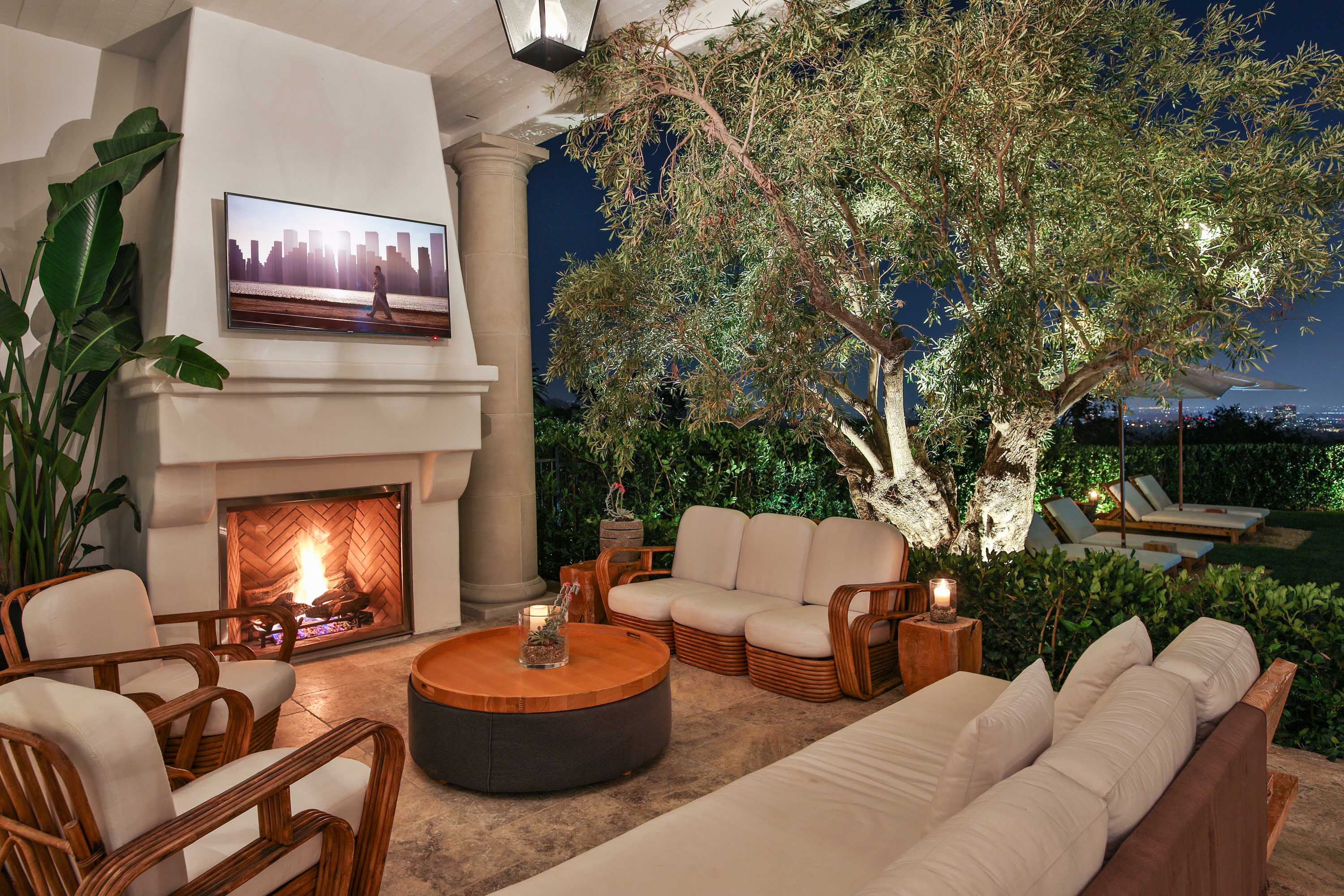 The main home has 180-degree oceans of the San Gabriel Mountains, downtown Los Angeles, and the Pacific Ocean. The grand entrance hall boasts 24-foot ceilings with French oak flooring connecting to the living room, which contains a limestone fireplace. The professional-grade kitchen features an antique wood-beam ceiling and access to an adjoining family room. Amenities in the onetime Reagan residence include a private cinema with cashmere-lined walls and a 2,000-bottle wine cellar.