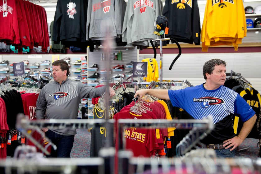 Brothers Todd, right, and Scott Yeomans, owners of a custom sportswear company, stand in their store in Prairie du Chien, Wisconsin. They try to make their products with American-made fabrics and American labor, but must competing with companies that use cheaper factories overseas. (AP Photo/David Goldman)