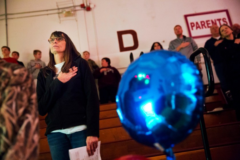 Marlene Kramer stands for the national anthem at a high school wrestling meet in Prairie du Chien, Wisconsin. “I said to myself, ugh, I can’t stand him.” And when he announced his candidacy, she thought it was a joke. “Then my husband said to me, ‘Just think, everything he touches seems to turn to money,’” she said, and she changed her mind. “I’m hoping he’ll make this country really rich.” (AP Photo/David Goldman)